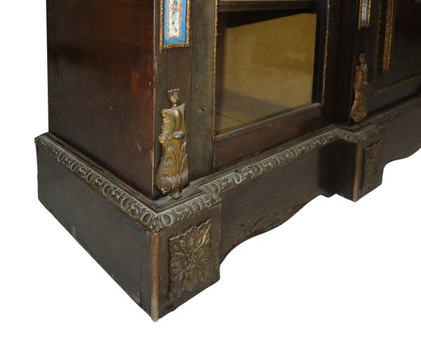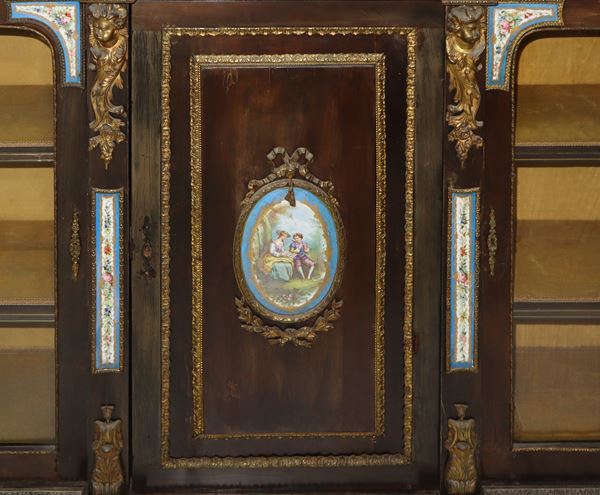 Con sportello centrale chiuso e due laterali a vetri. Ceramiche di Sevres applicate sul fronte. Cornici e bronzi in metallo drato applicati sul fronte.