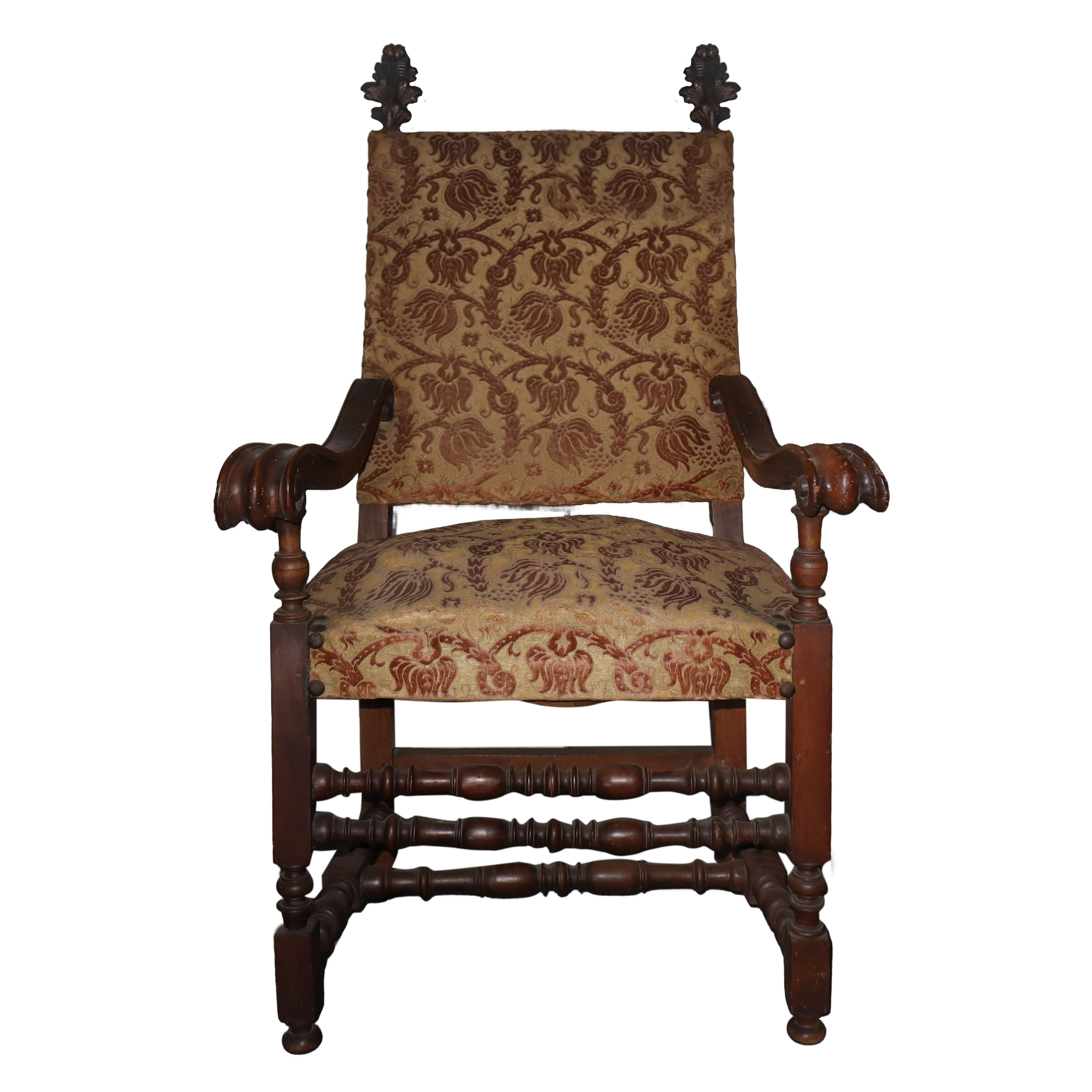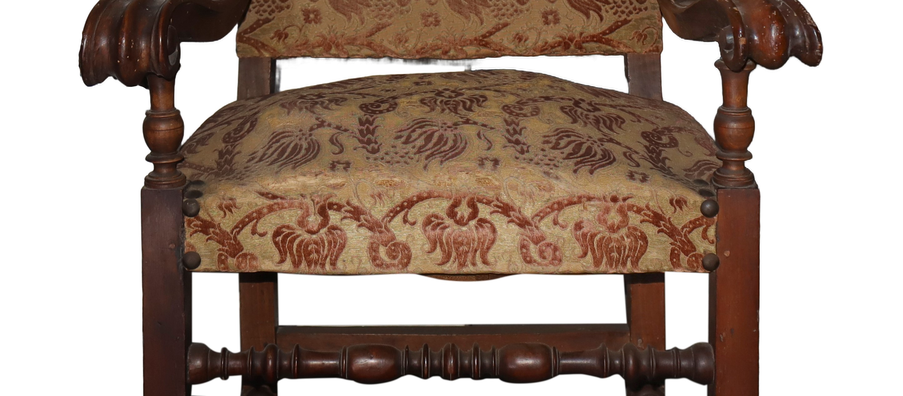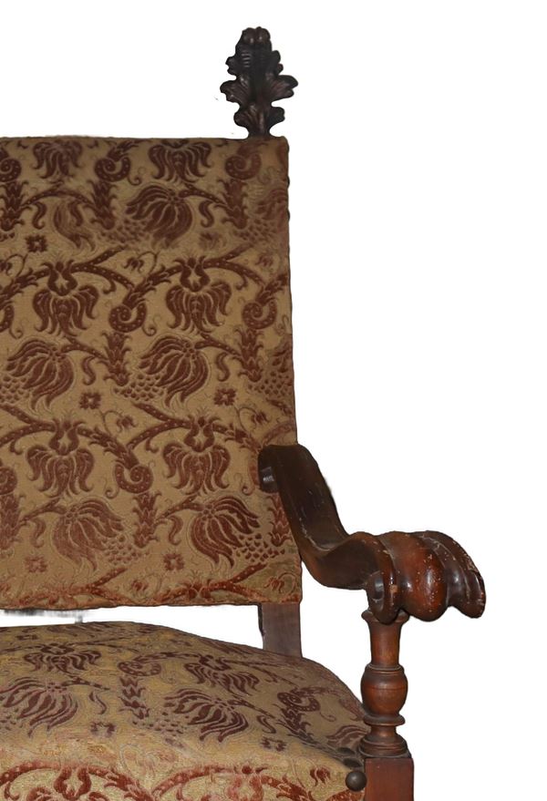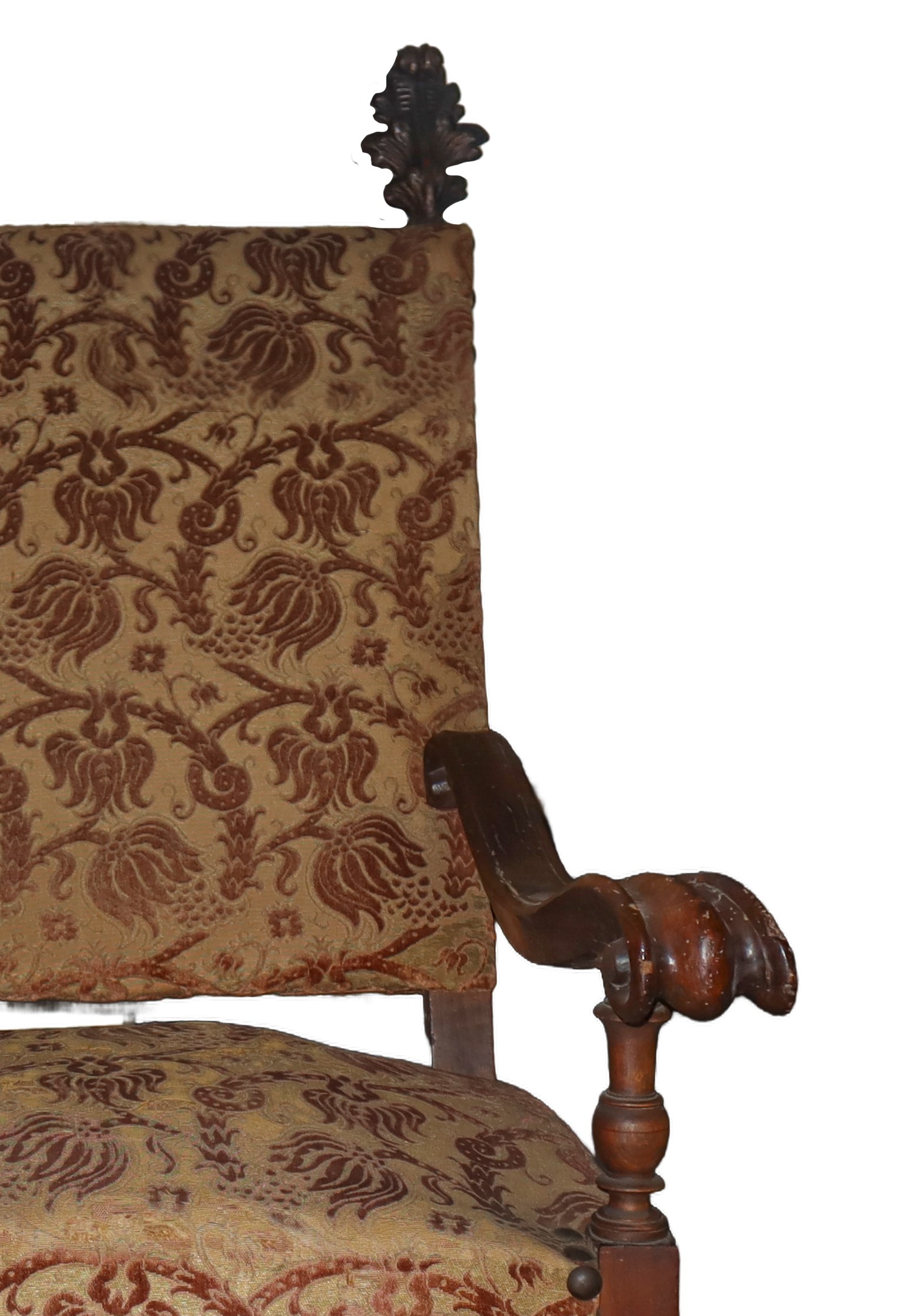 Con braccioli a riccioli e spalliera retta con finali ai lati a foglia d'acanto, legacci a rocchetto , tappezzeria in velluto damascato.