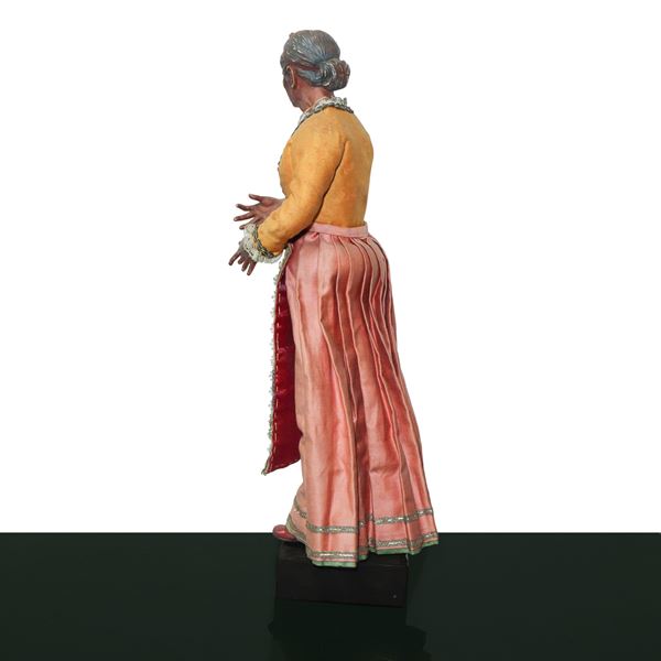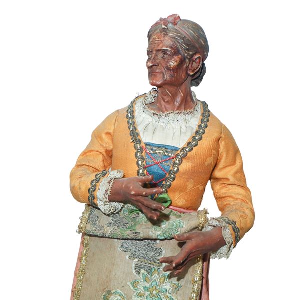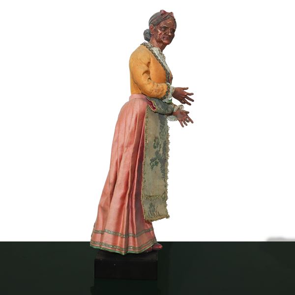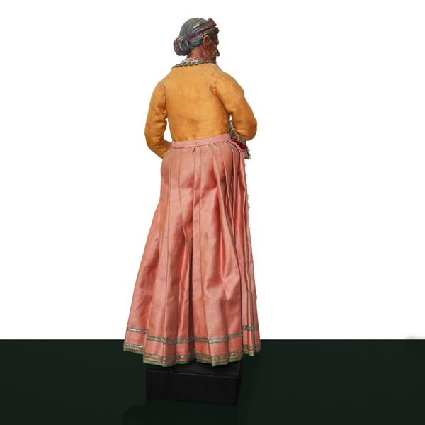 Personaggio presepiale in terracotta e legno con vesti in cotone, raso e passamaneria: massaia popolana con fiocco in testa, Napoli XIX secolo