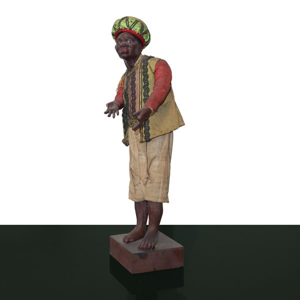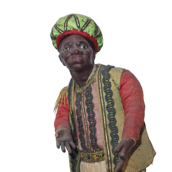 Personaggio presepiale in terracotta e legno con vesti in cotone, raso e passamaneria: servitore moro con turbante, Napoli XIX secolo