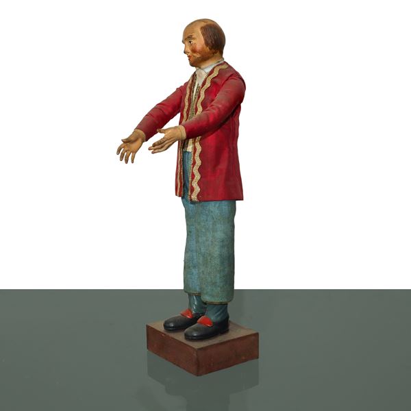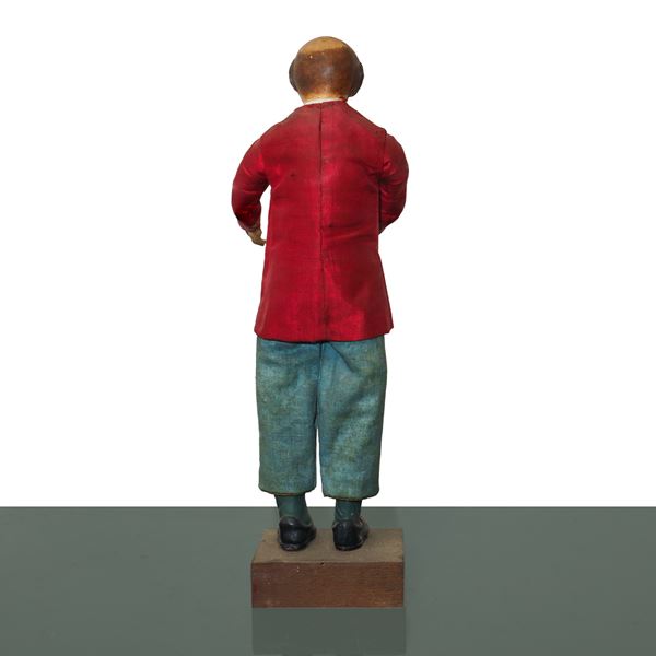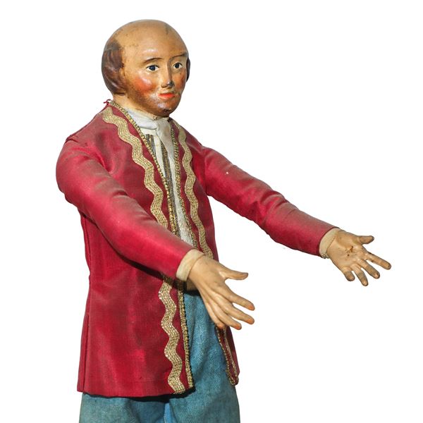 Personaggio presepiale in terracotta e legno con vesti in cotone, raso e passamaneria: uomo calvo con giacca rosa e foulard bianco, Napoli XIX secolo