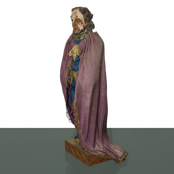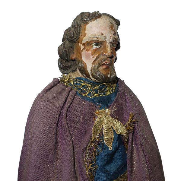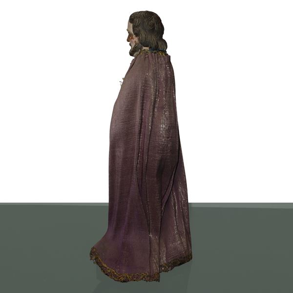 Personaggio presepiale: San Giuseppe IN TERRACOTTA E LEGNO CON VESTI IN COTONE, RASO E PASSAMANERIA