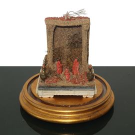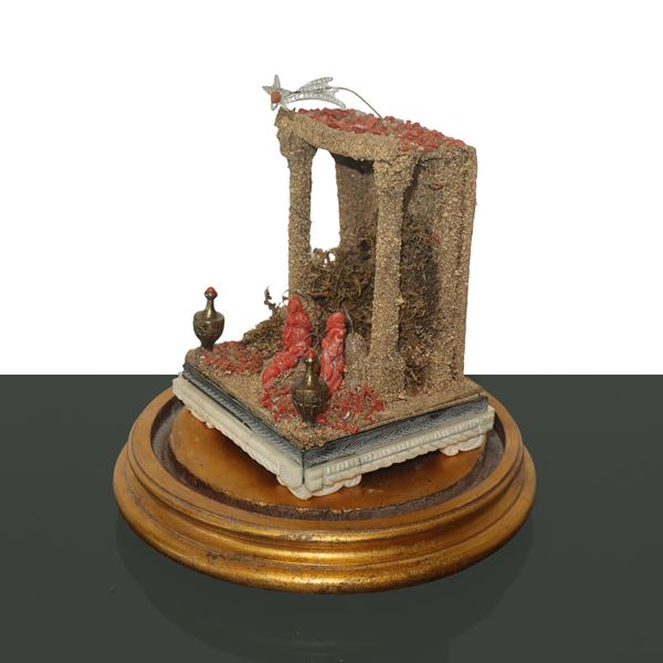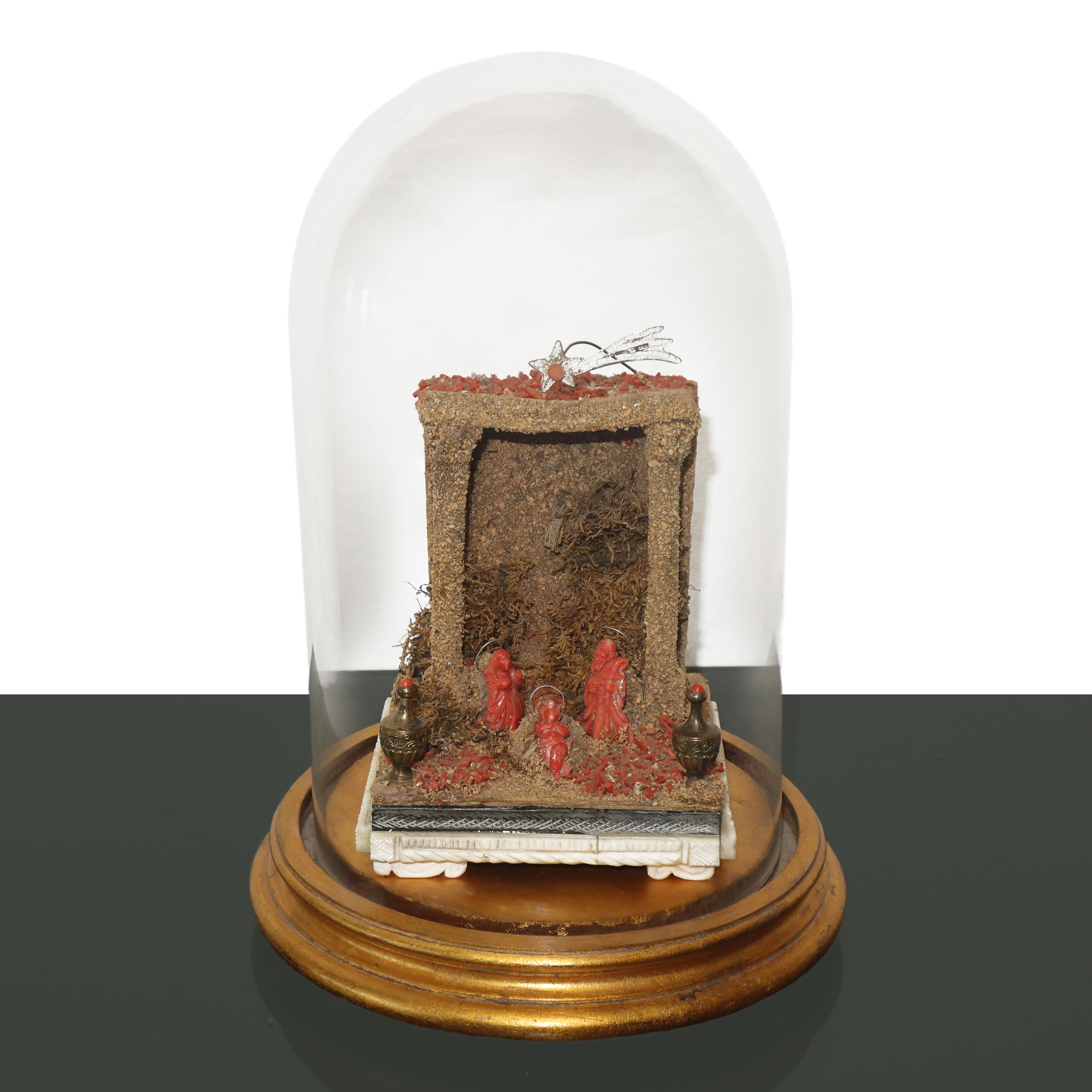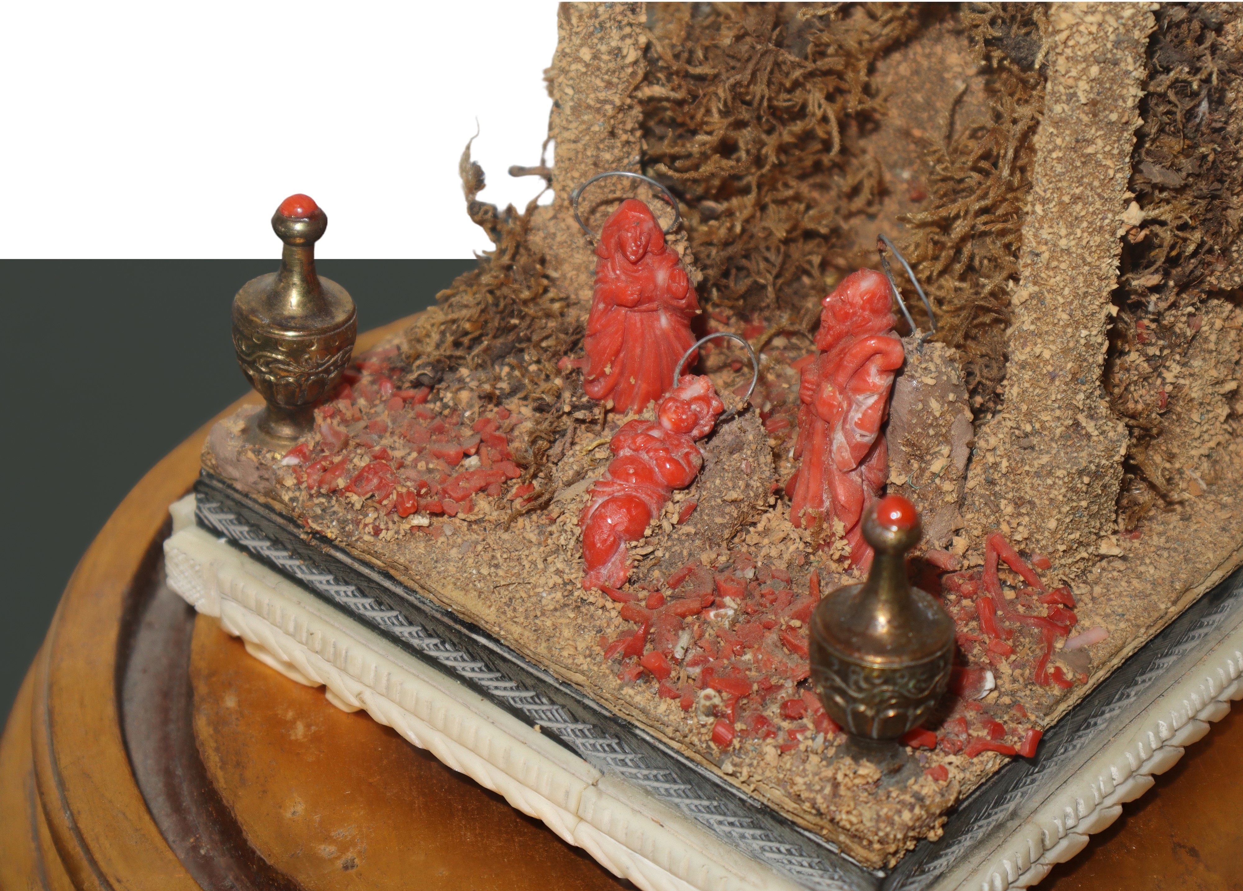 Presepe in corallo rosso Torre del Greco in teca di vetro, Inizi XX secolo