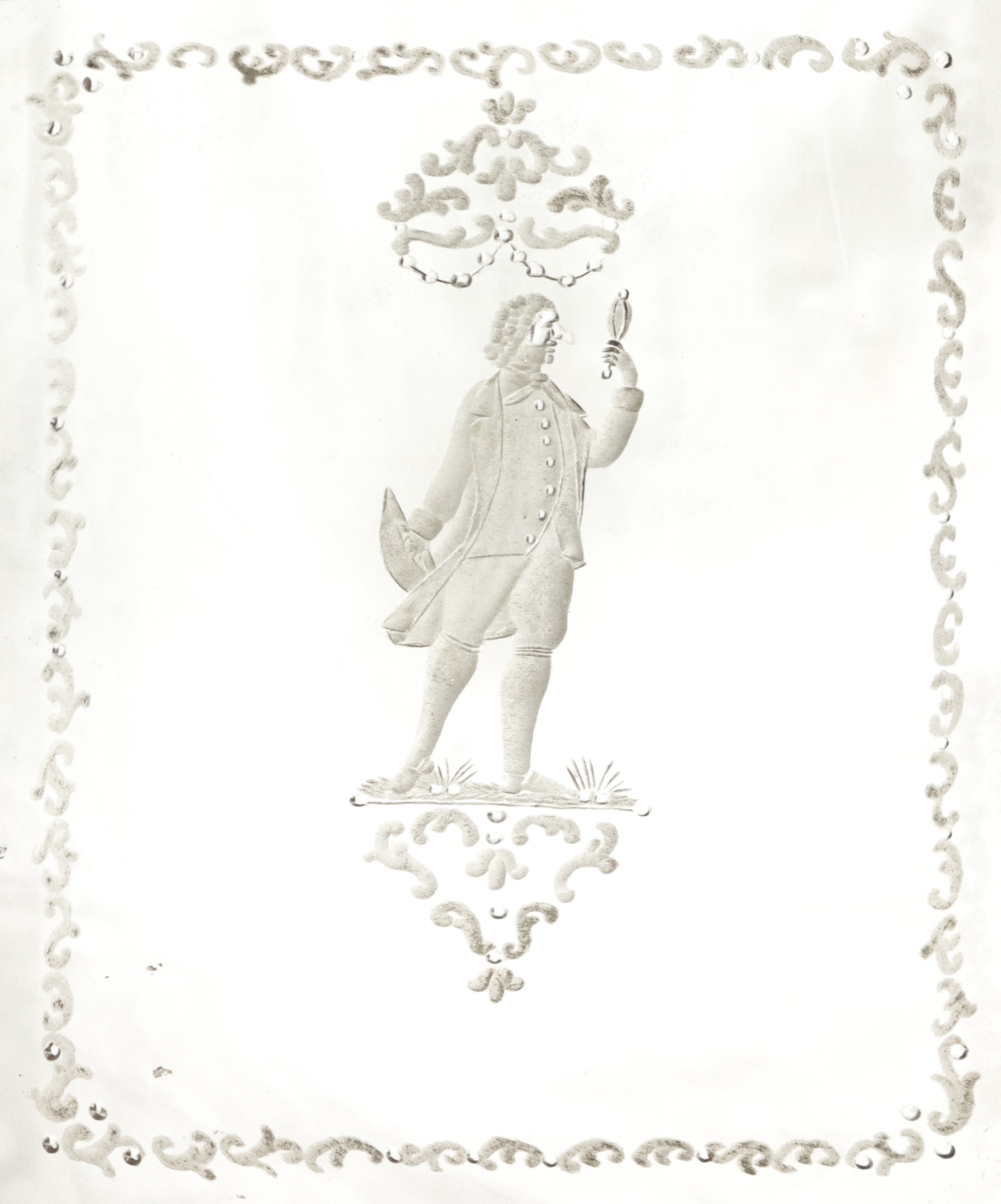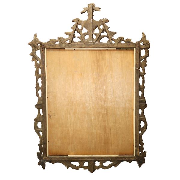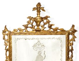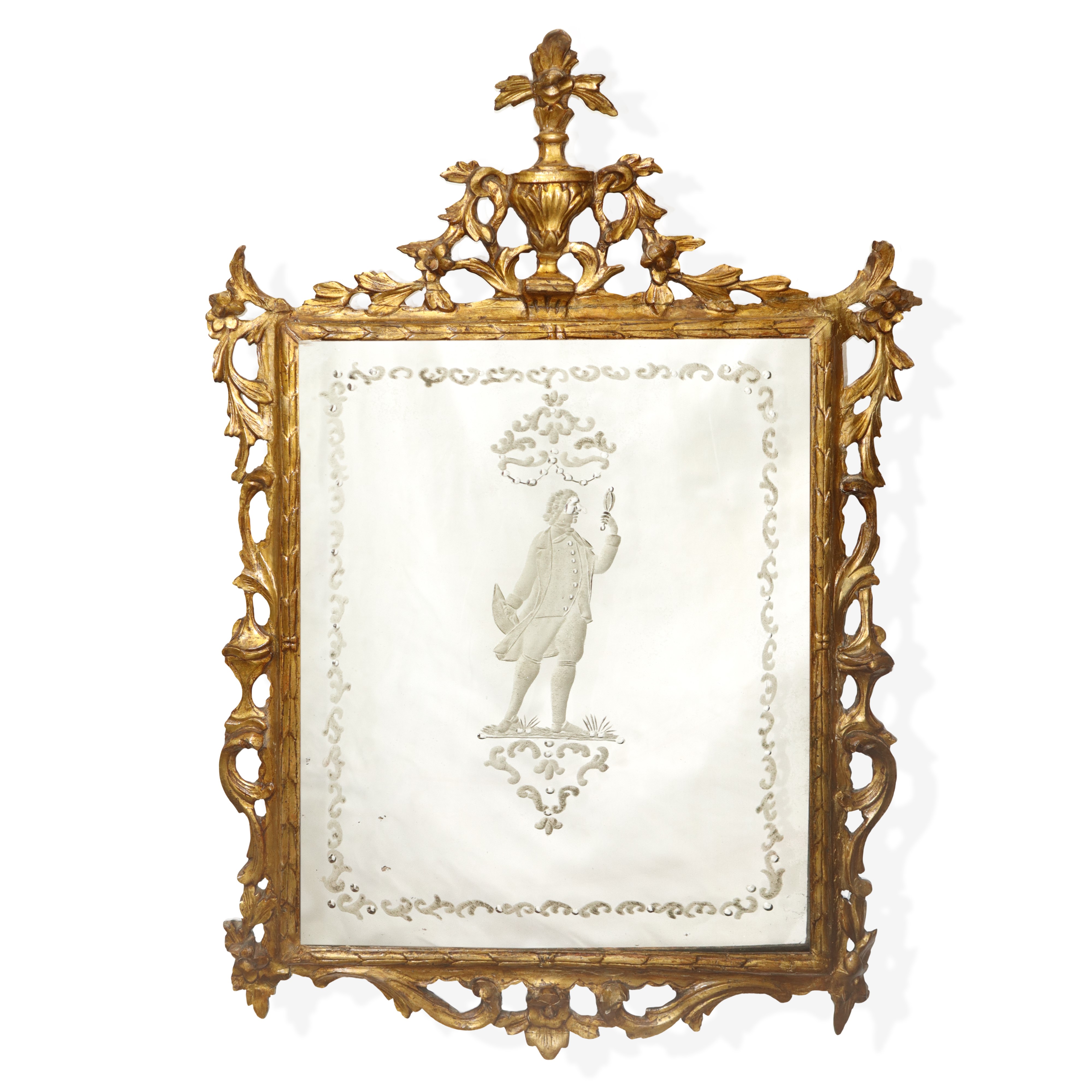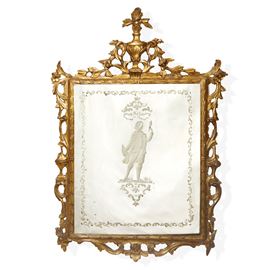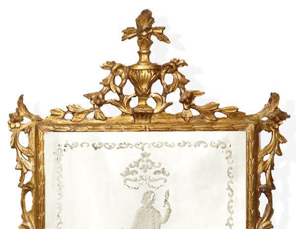 Specchiera in cornice dorata con specchio al mercurio bulinato con personaggio carnascialesco al centro