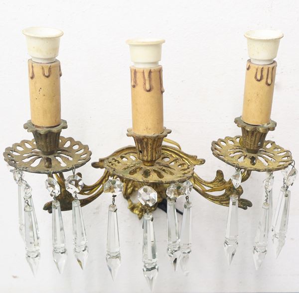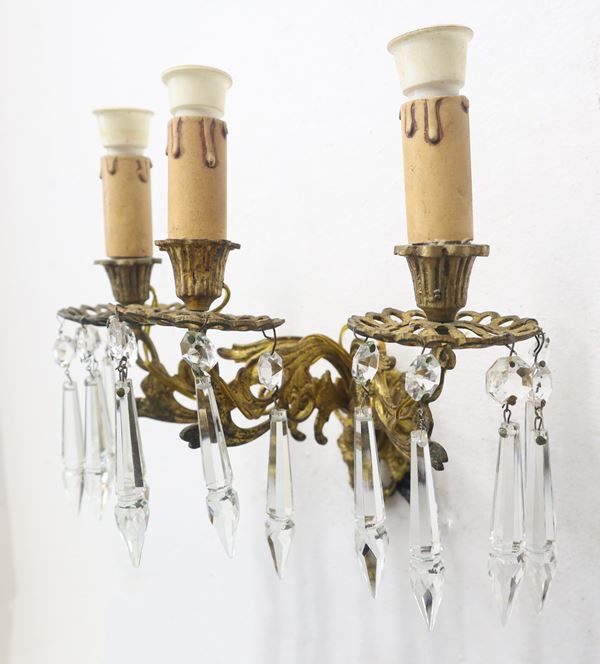 Coppia di applique in metallo dorato a tre luci, XIX Secolo