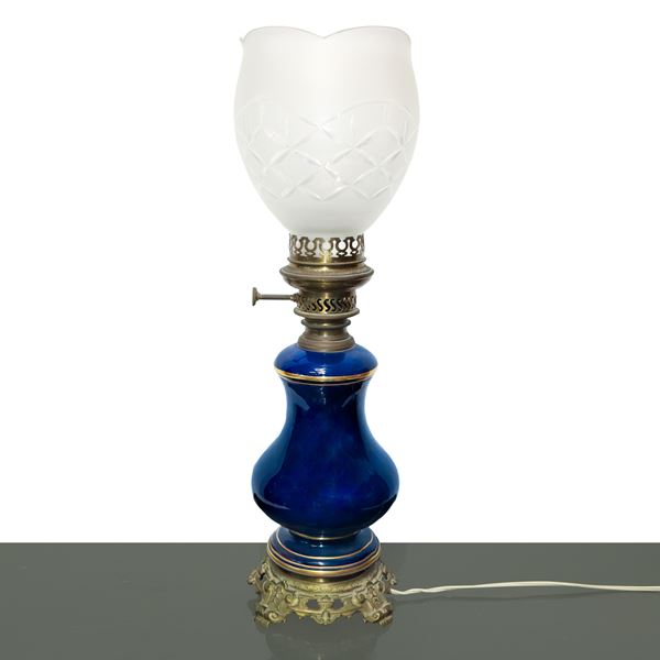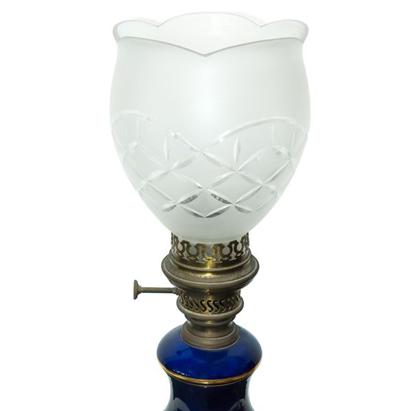 Lume in porcellana blu con fiori policromi dipinti sul fronte entro ovale dorato con diffusore in vetro intagliato