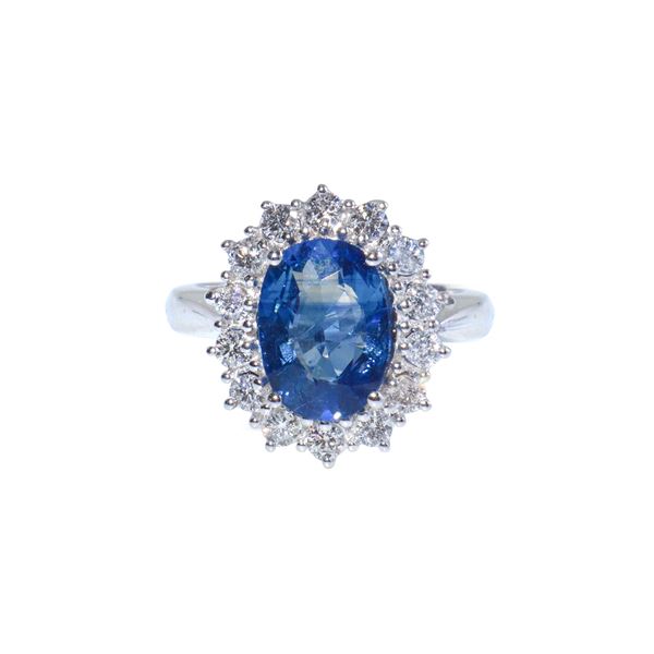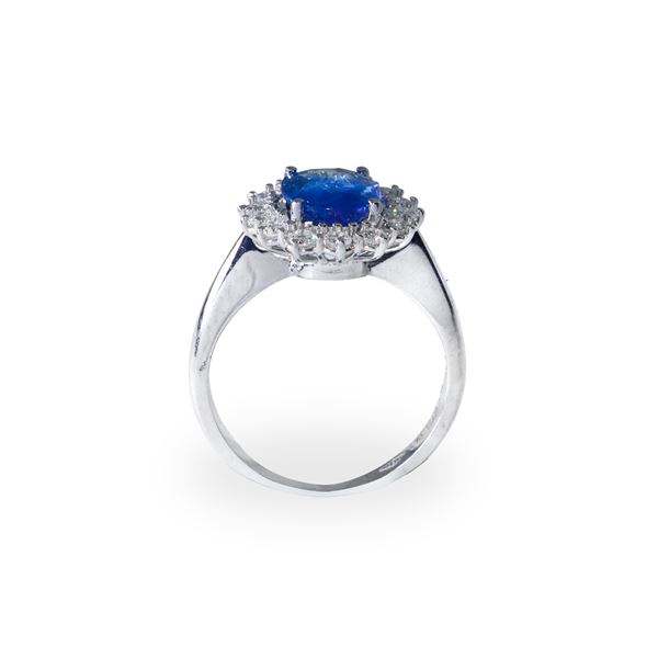 Anello in oro bianco 18 kt con zaffiro naturale (provenienza Sri Lanka) con contorno di brillanti