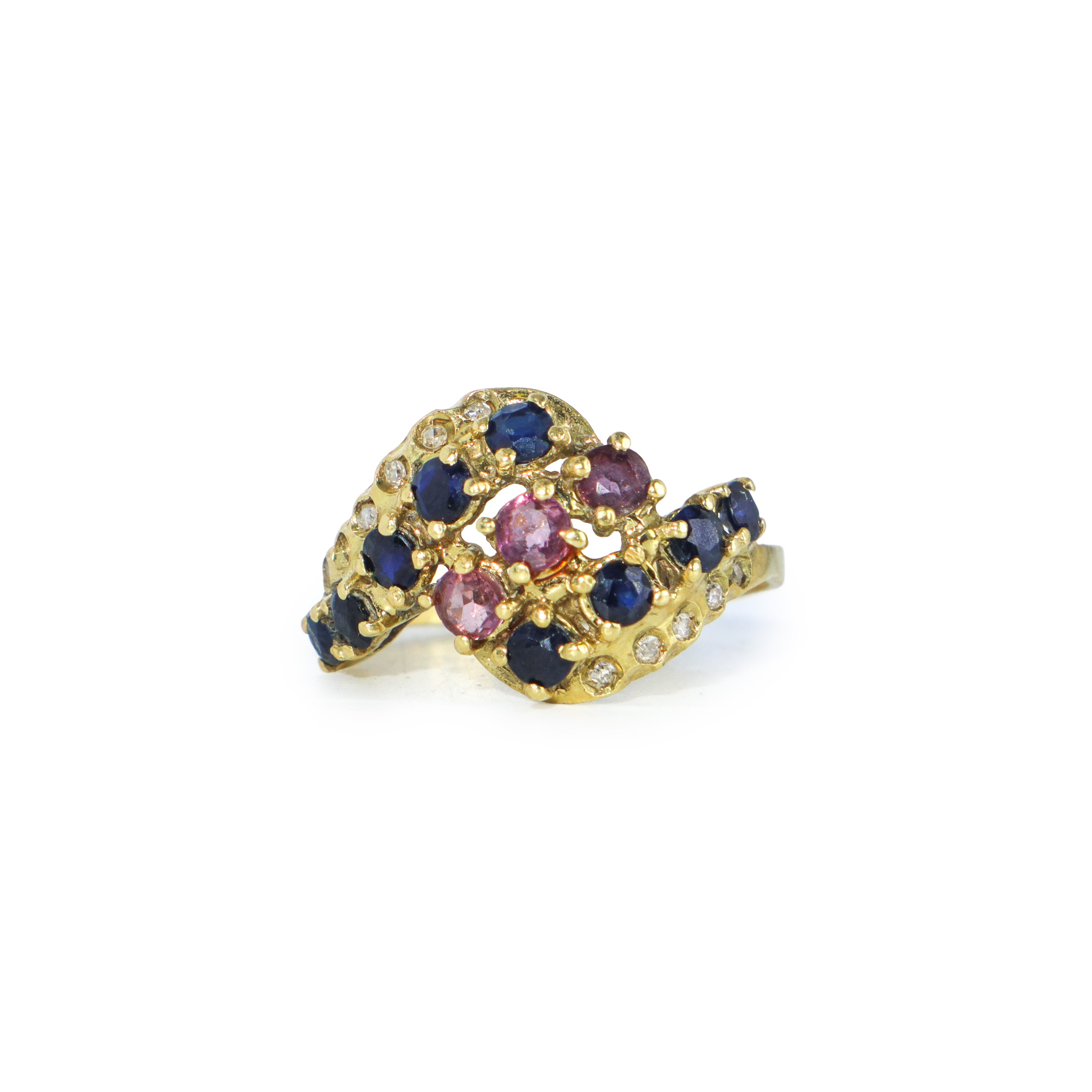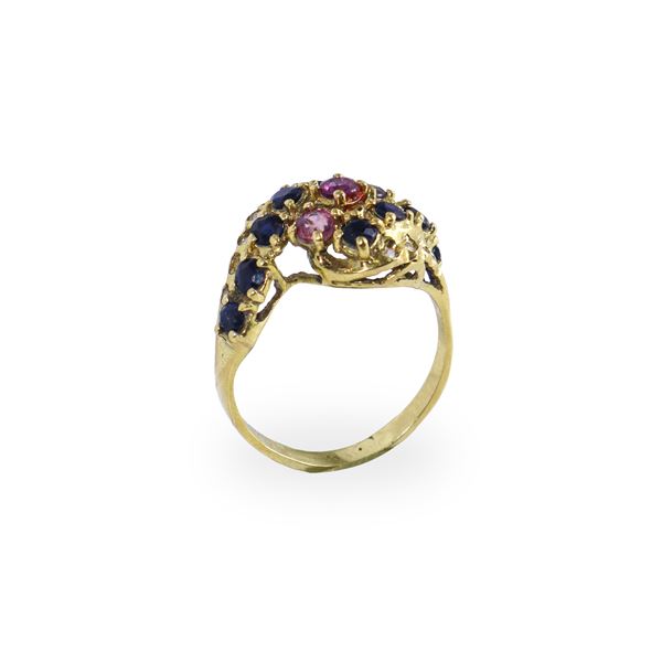 Anello in oro giallo 750 con zaffiri, tormaline rosa e diamanti