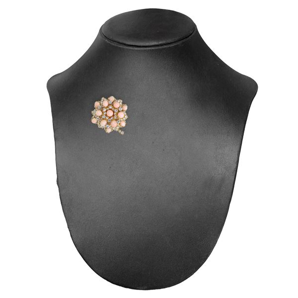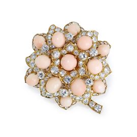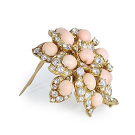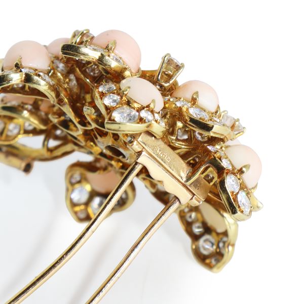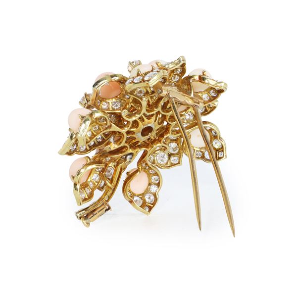 Spilla Bulgari a motivo floreale in oro giallo 18kt, corallo e diamanti taglio brillante, Anni 70