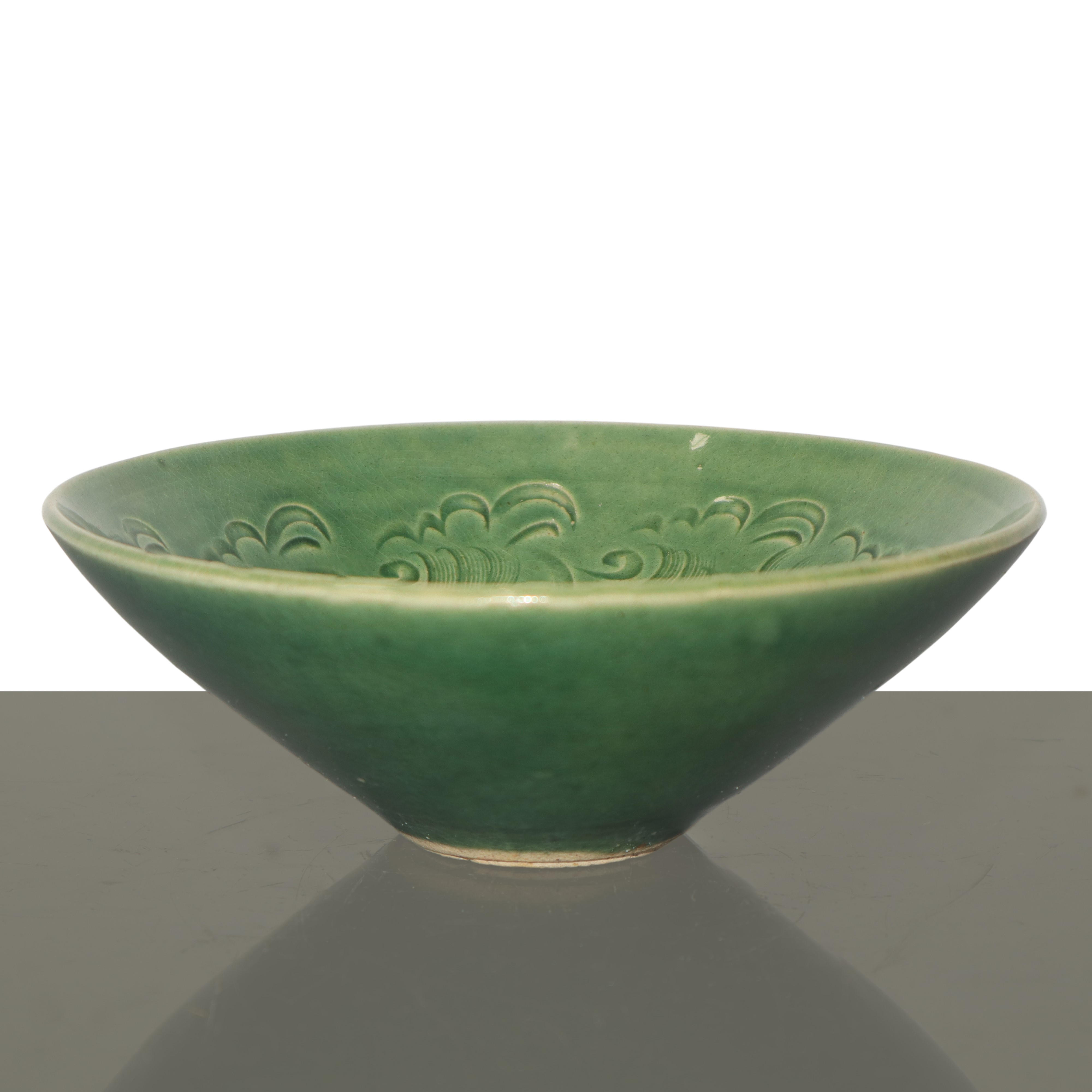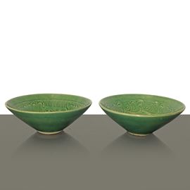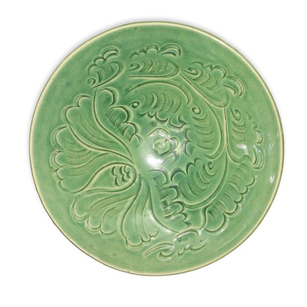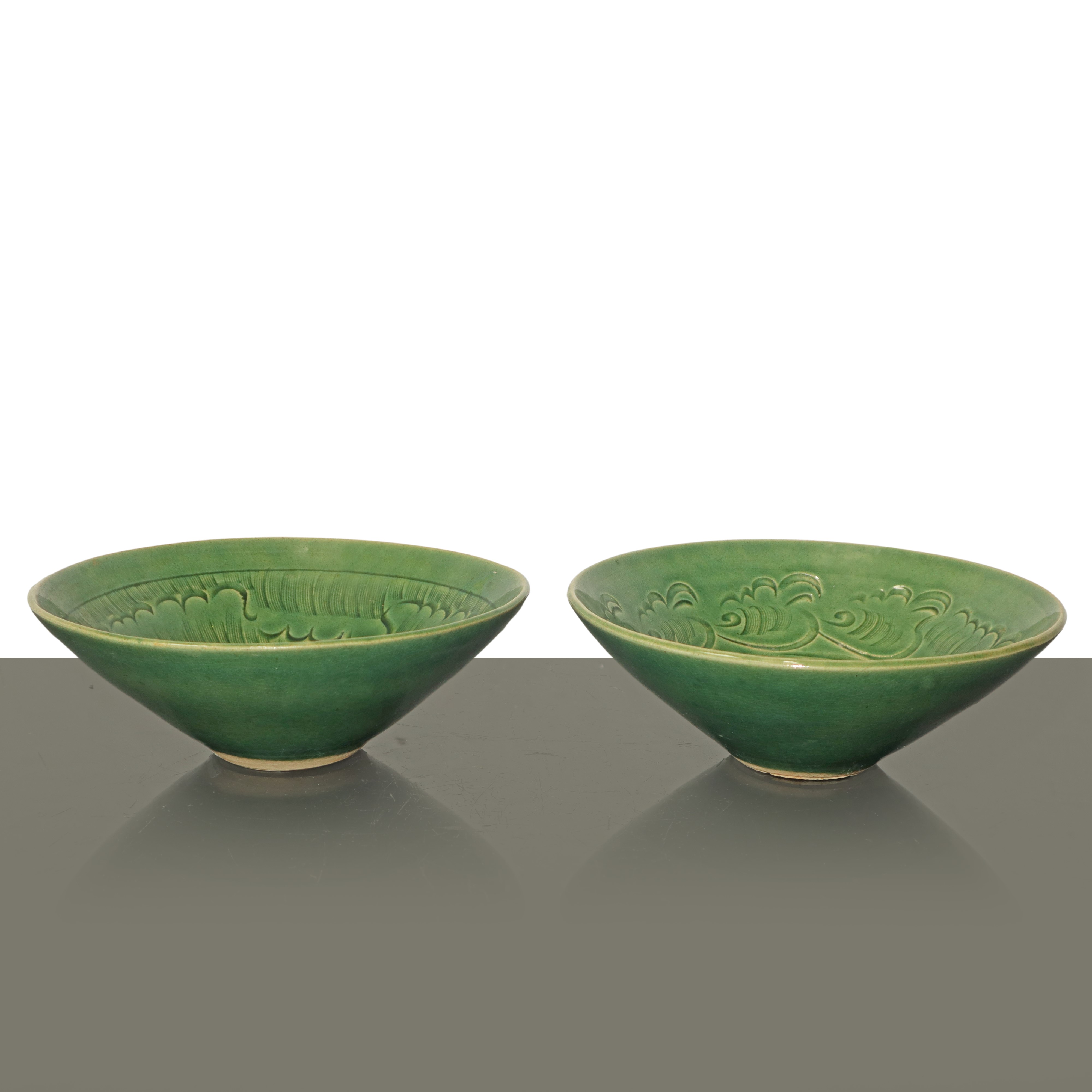 Coppia di ciotole in ceramica celadon color verde giada con decorazione floreale, Dinastia Qing