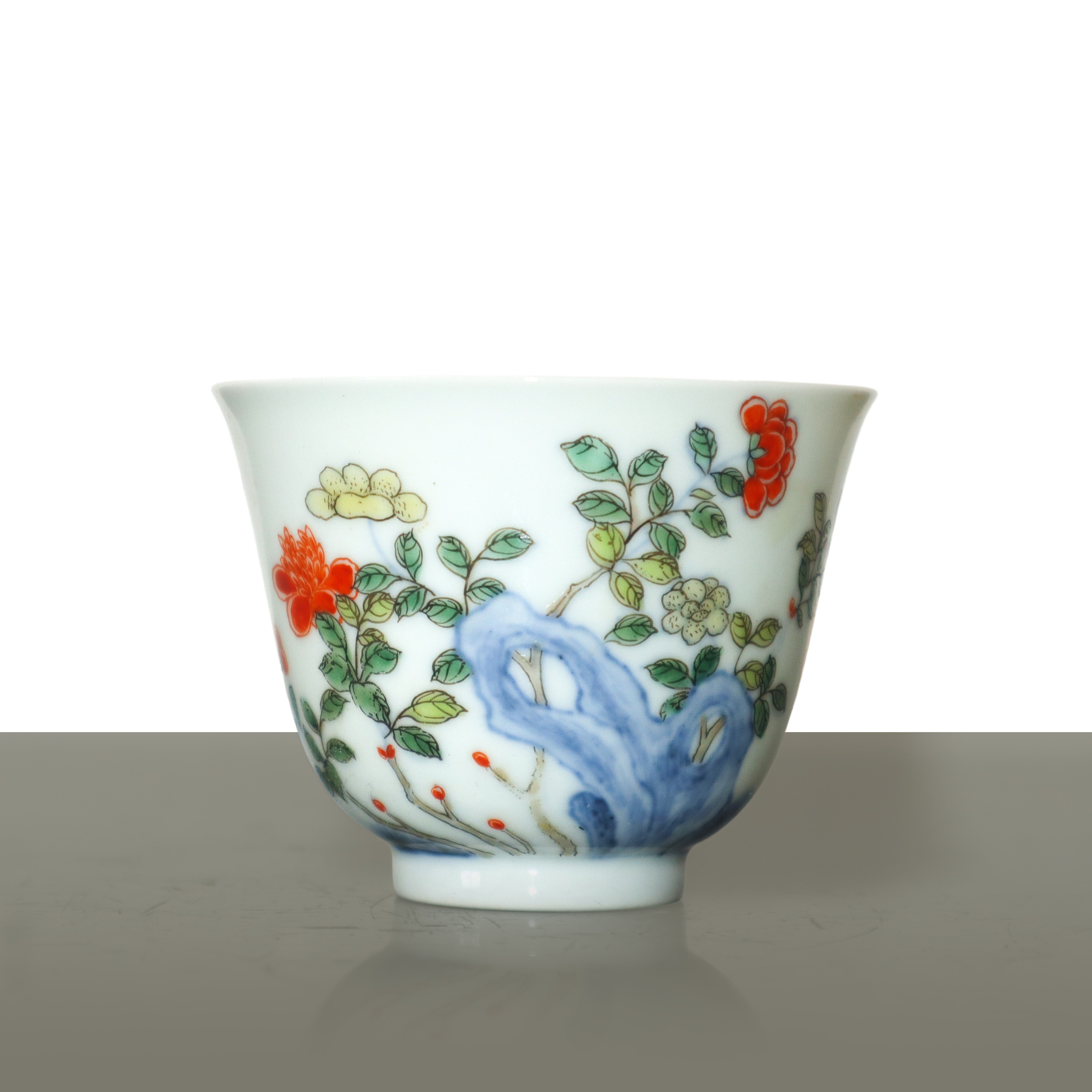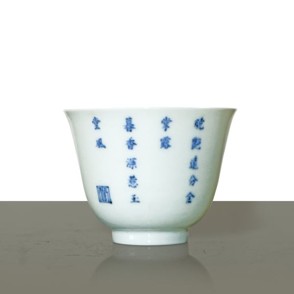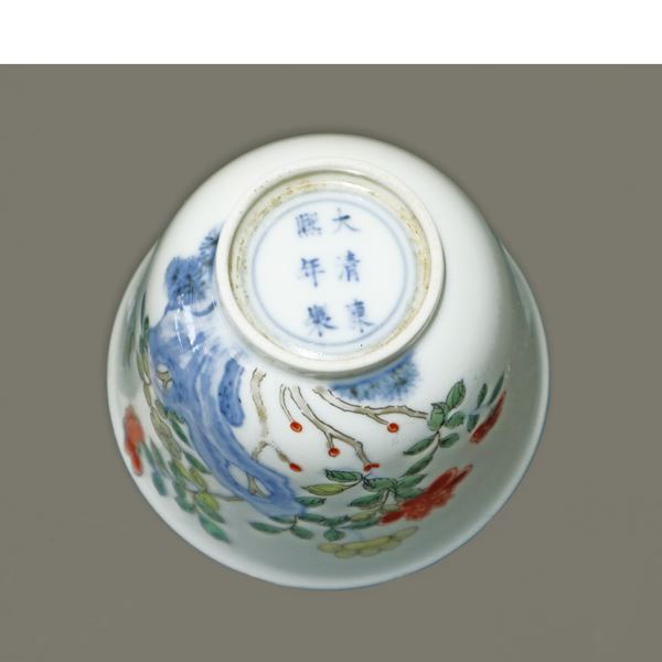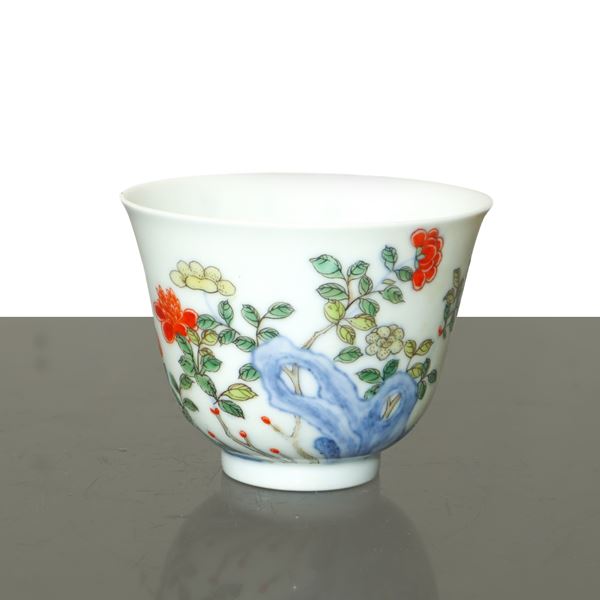 Piccola tazza in porcellana cinese in stile famiglia verde con decorazioni floreali ed iscrizione poetica, Dinastia Qing XVIII sec. periodo Kangxi