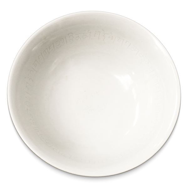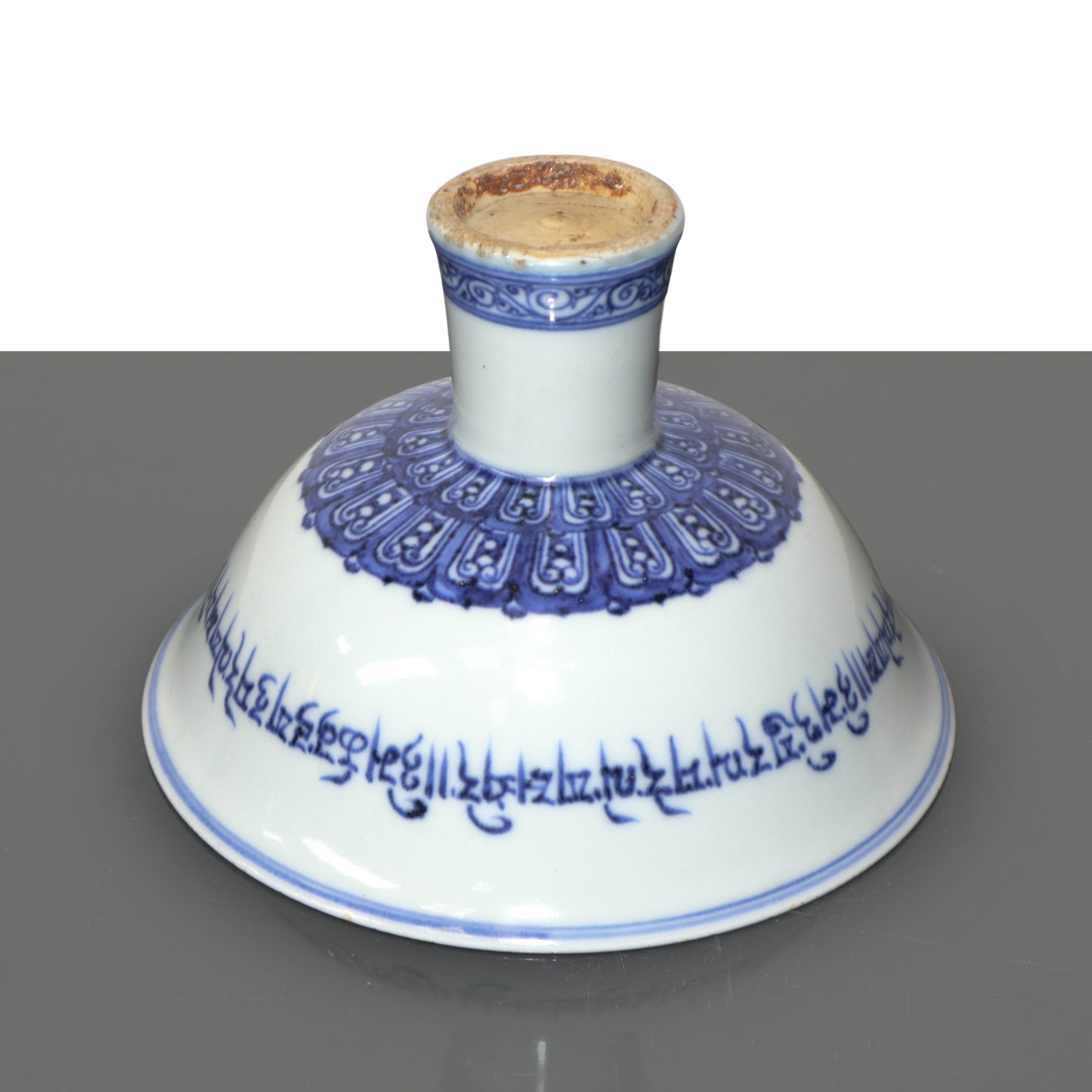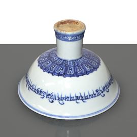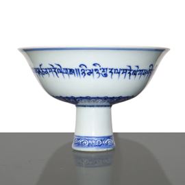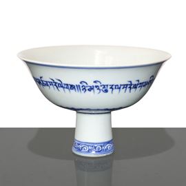 Tazza cerimoniale cinese smaltata in bianco e blu con iscrizioni tibetane, Dinastia Ming