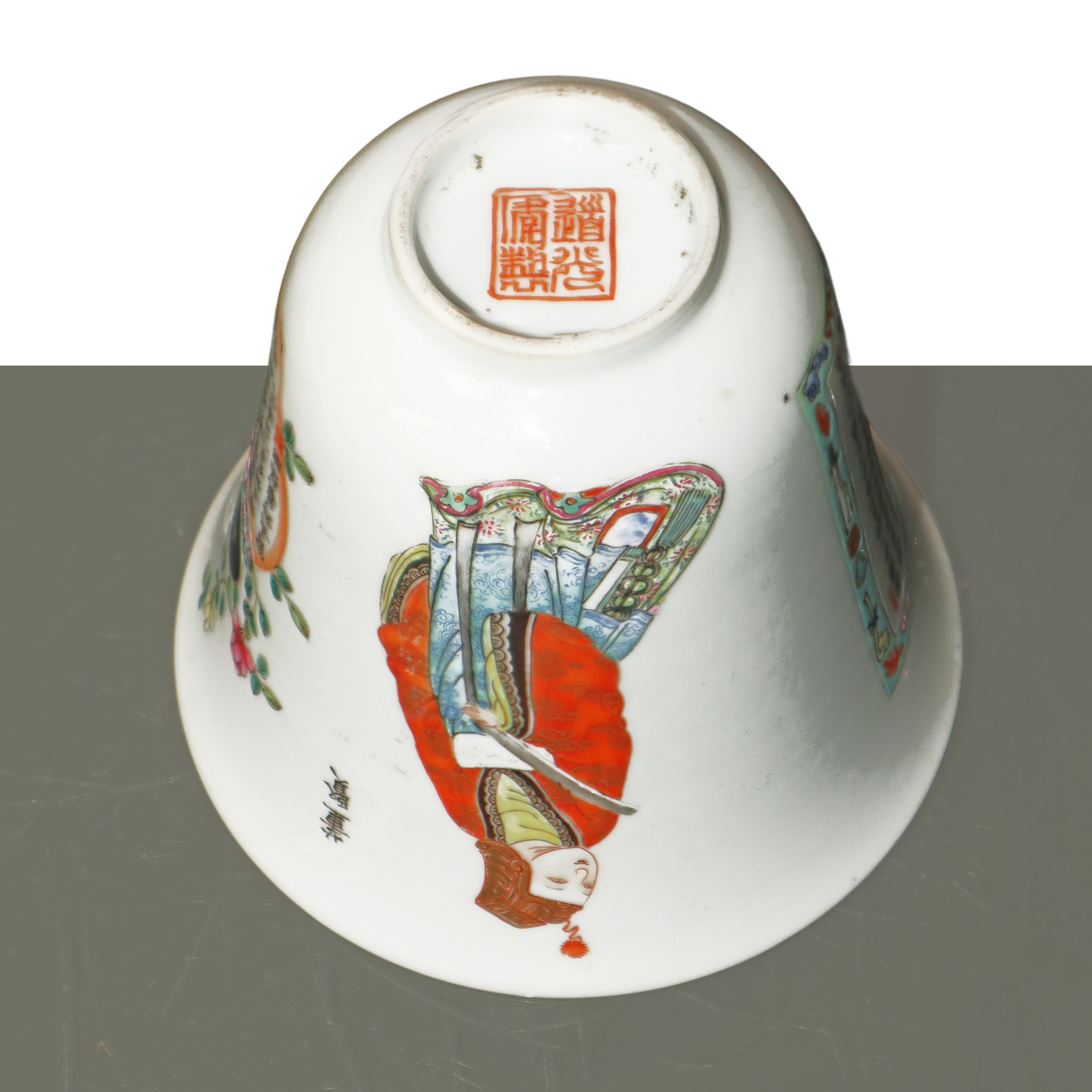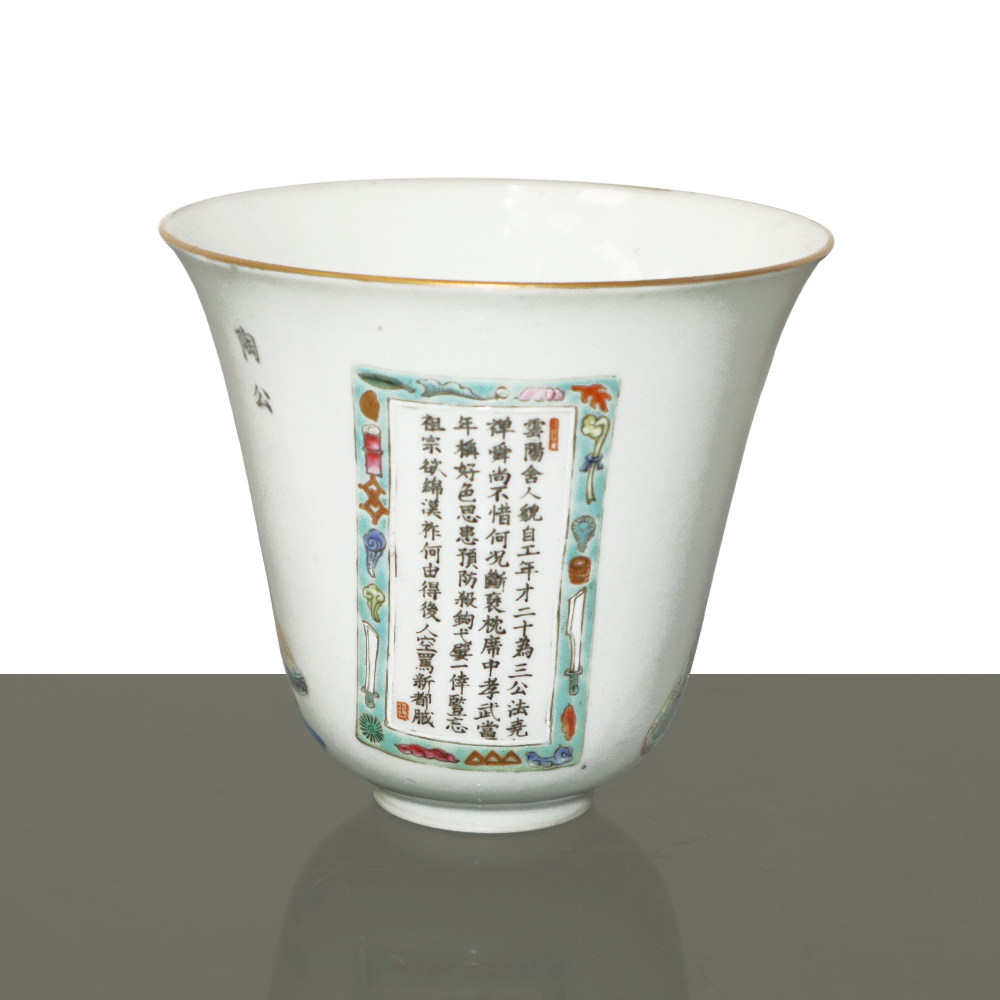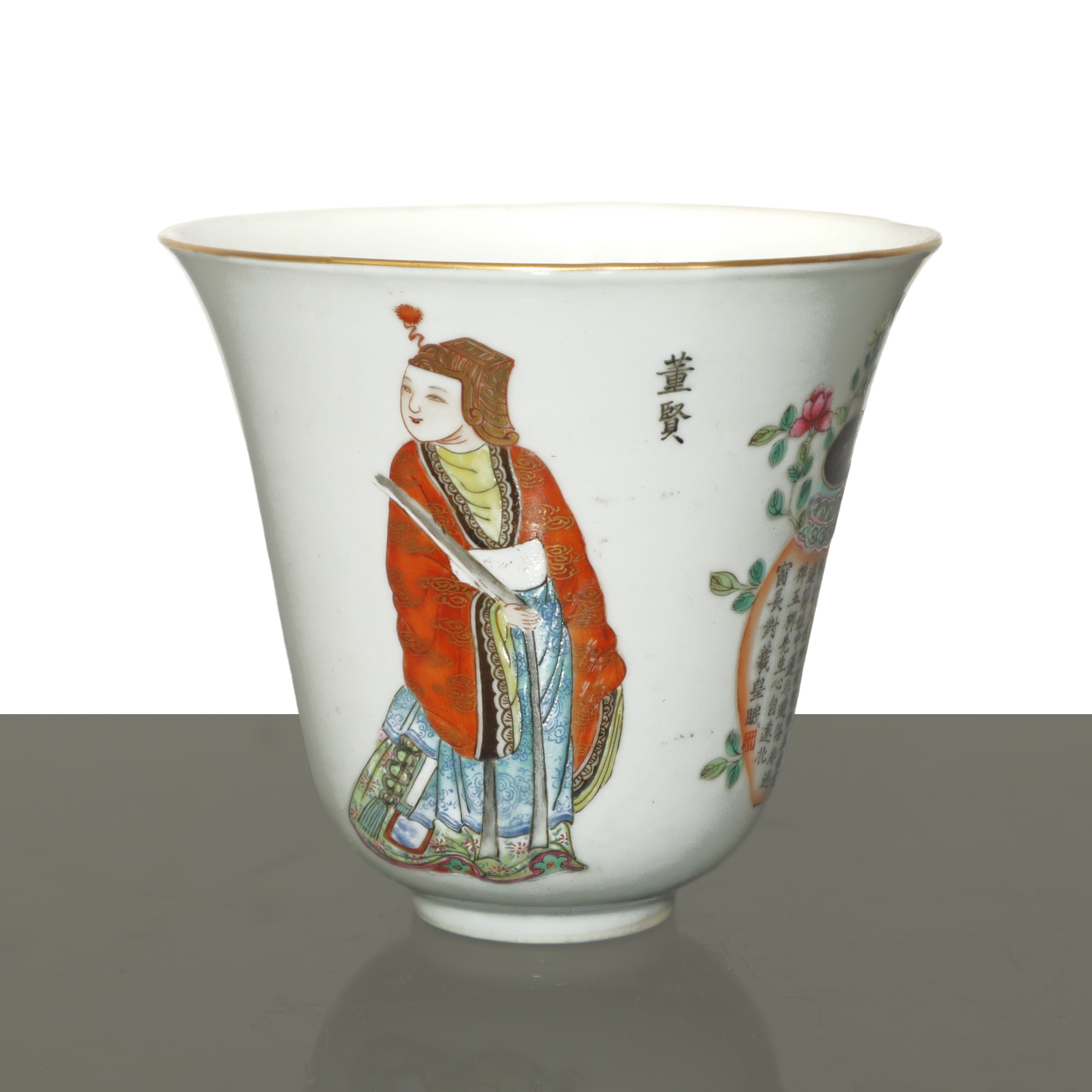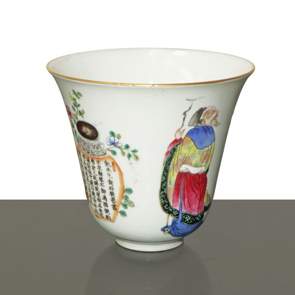Tazza in porcellana cinese in stile famiglia rosa con figure tradizionali ed iscrizioni poetiche, Dinastia Qing