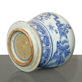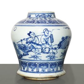 Vaso cinese smaltato bianco e blu con figurazioni tradizionali e decori, XIX sec.