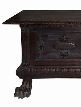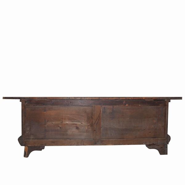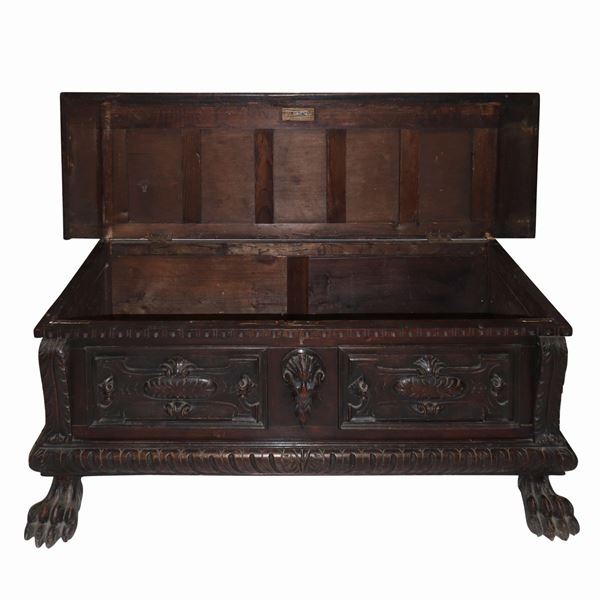 Piedi leonini, fronte con grottesche e conchiglie intagliate. Coperchio dentellato