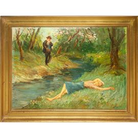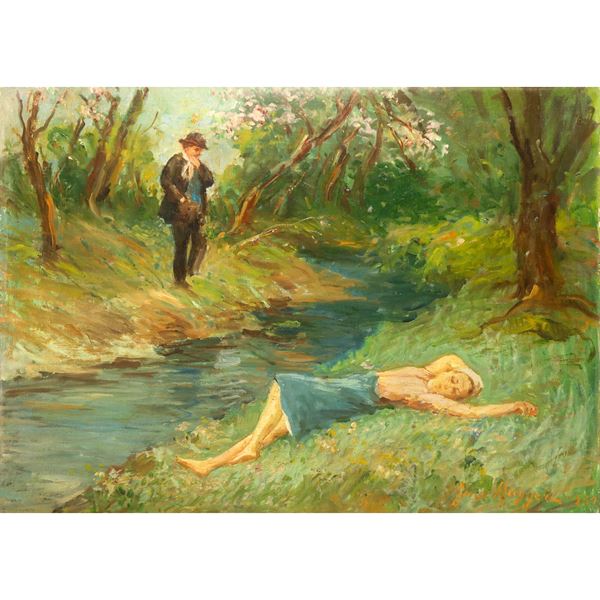 Scena nel bosco con fiume, donna distesa e uomo stante, 1991