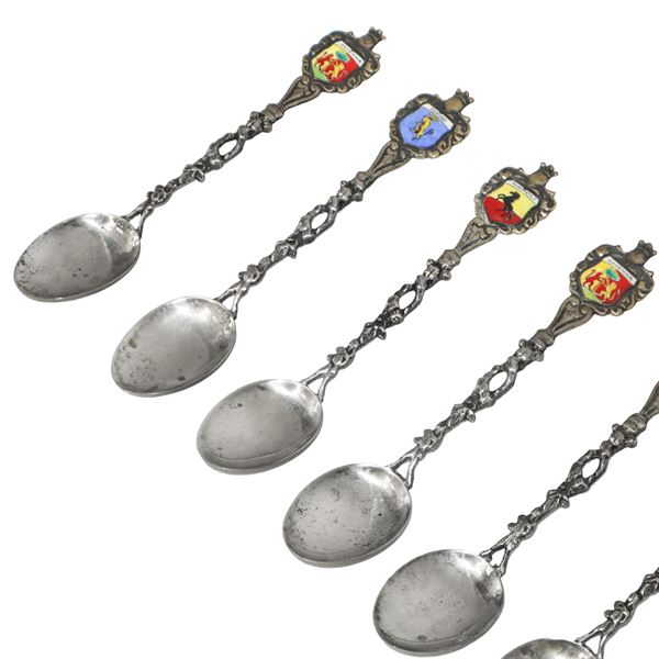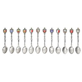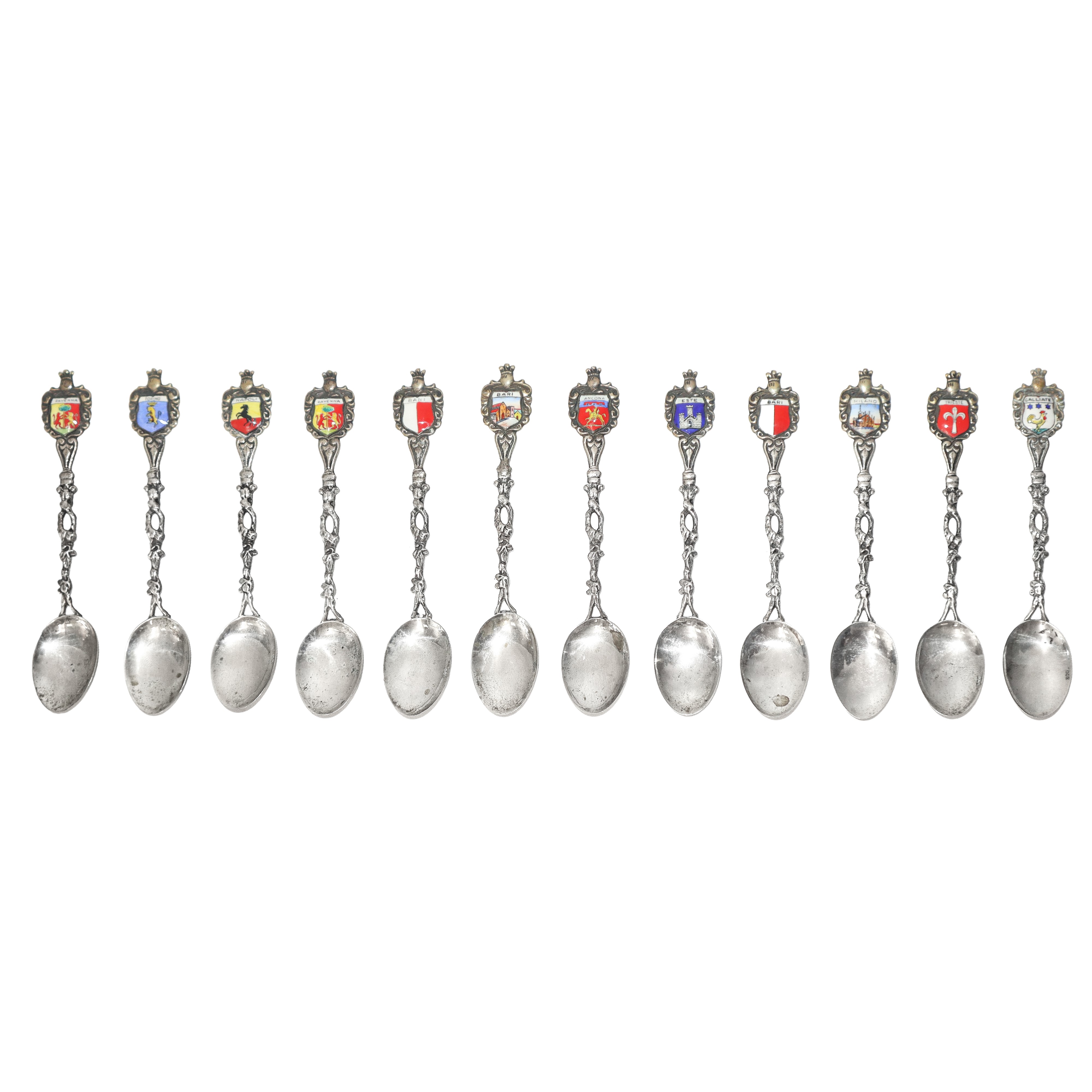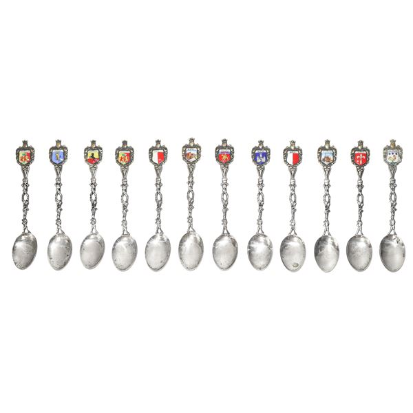 12 cucchiaini in argento 800, con smalti raffiguranti stemmi di città italiane. H cm 11,5
