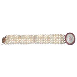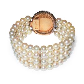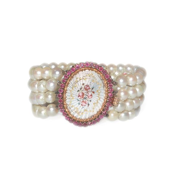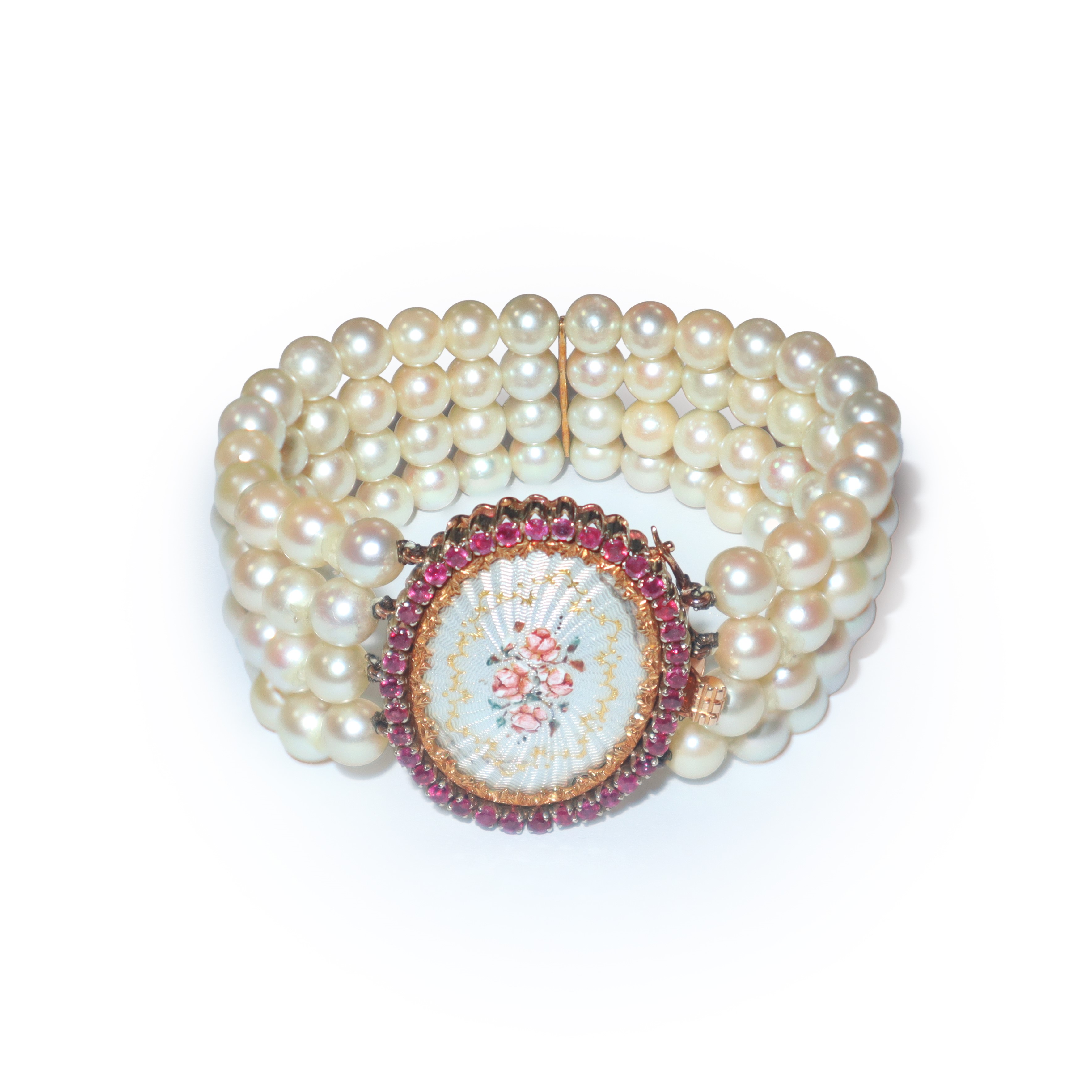 Bracciale con 4 fili di perle e chiusura in oro con micro mosaico e scaglie di brillanti