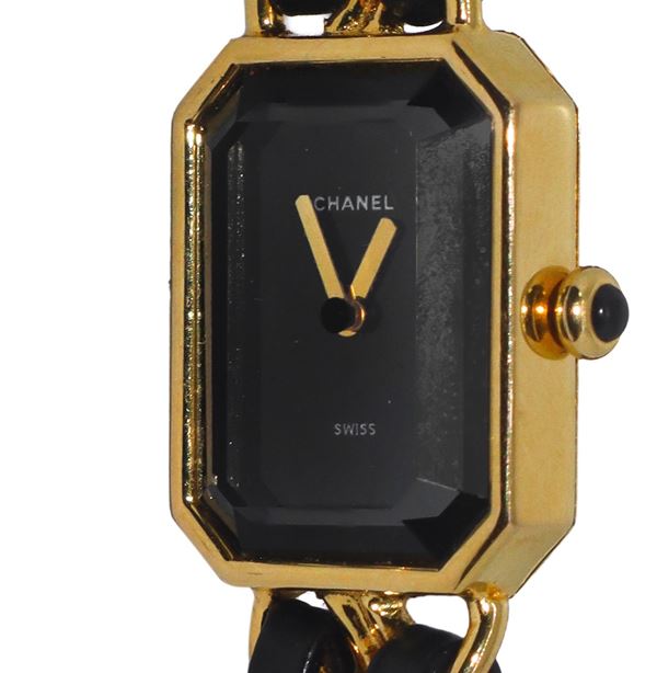 Cassa ottagonale, maglia bracciale catena dorata e pelle nera, movimenzo al quarzo. Logo all'interno del quadrante. Retro della cassa marchio Chanel Paris Plaque or g 20 m quartz swiss made X.N. 50713 CHANEL 1987. Piccolissima scollatura della pelle sulla maglia interna.