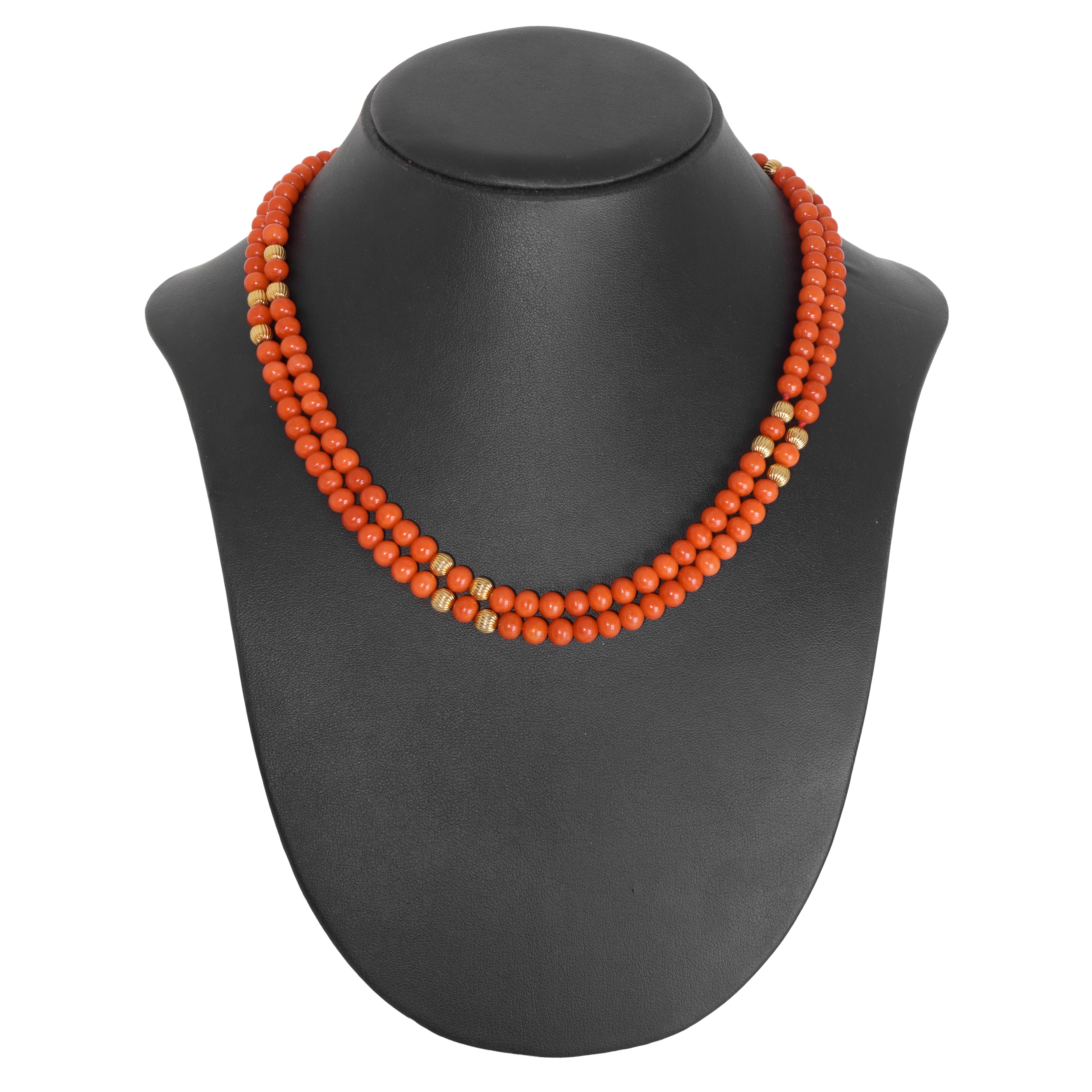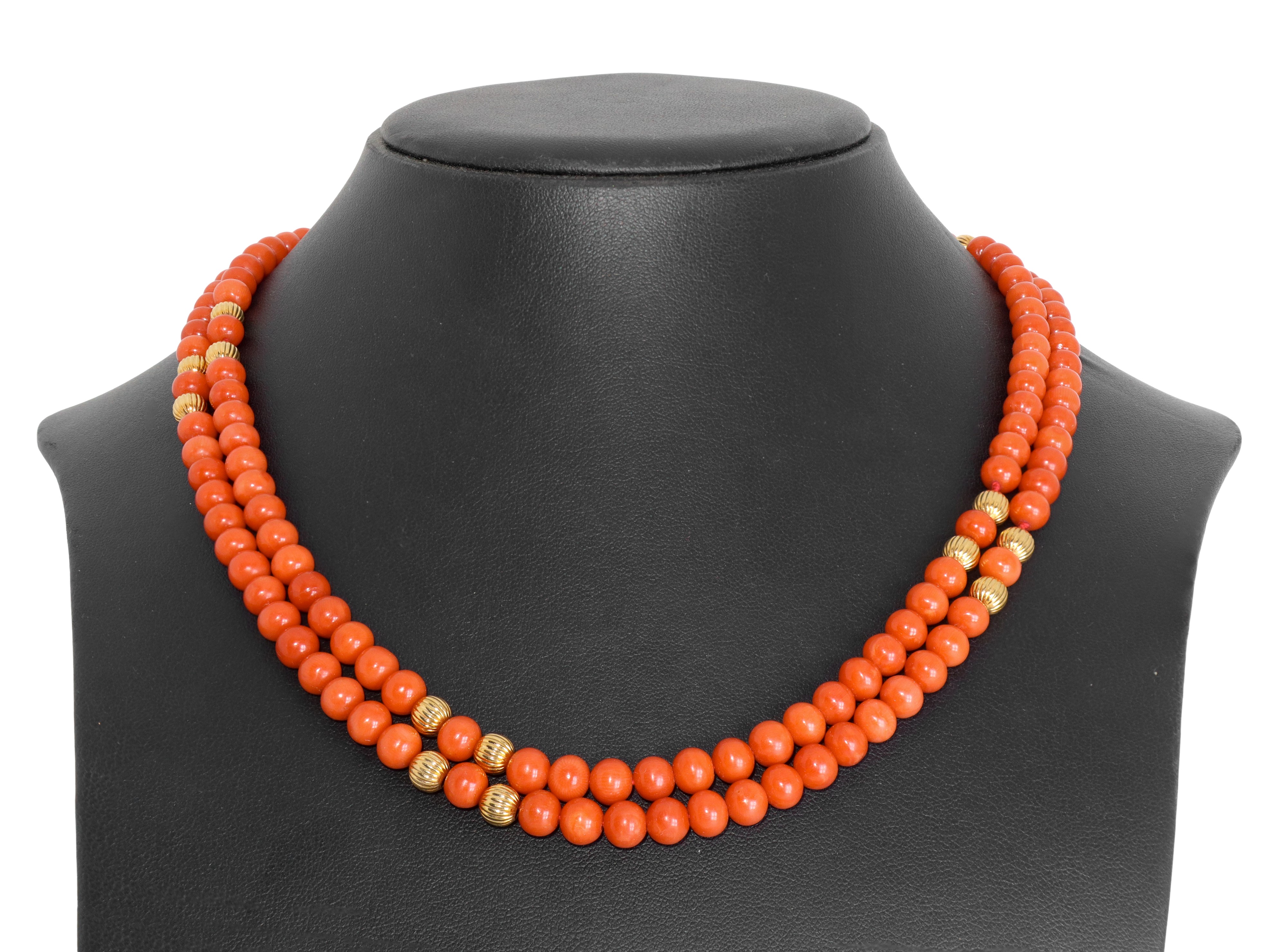 Collana con grani in corallo rosso inframezzati da grani dorati scanalati