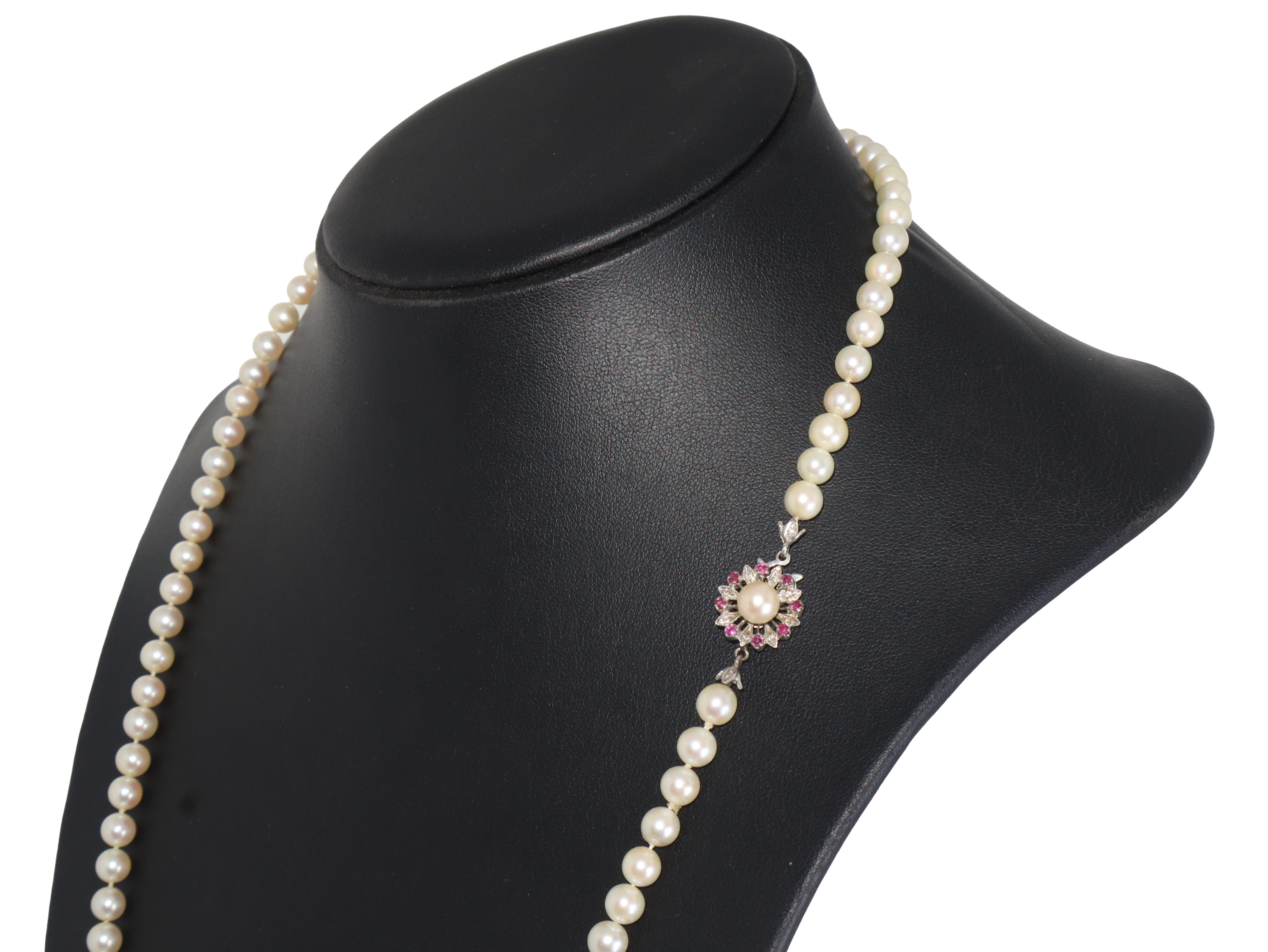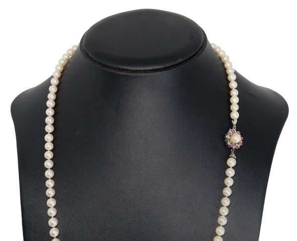 Collana di perle con susta a guisa di fiore in oro bianco 750 con perla centrale