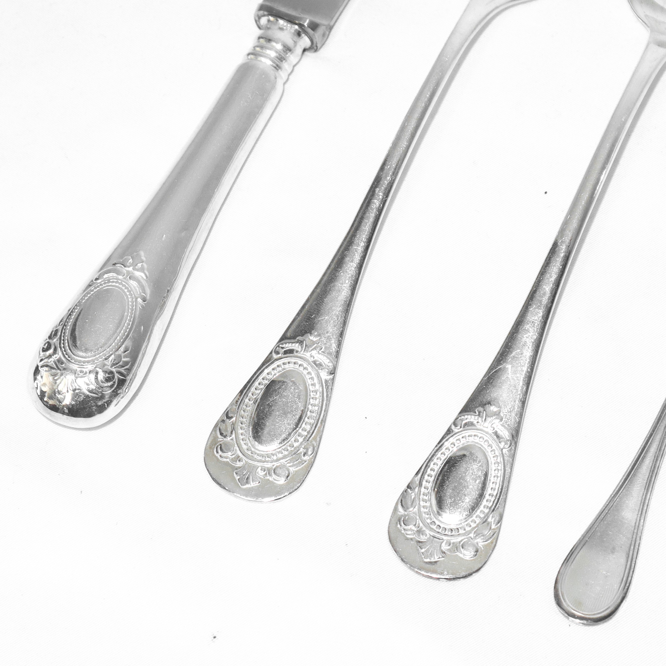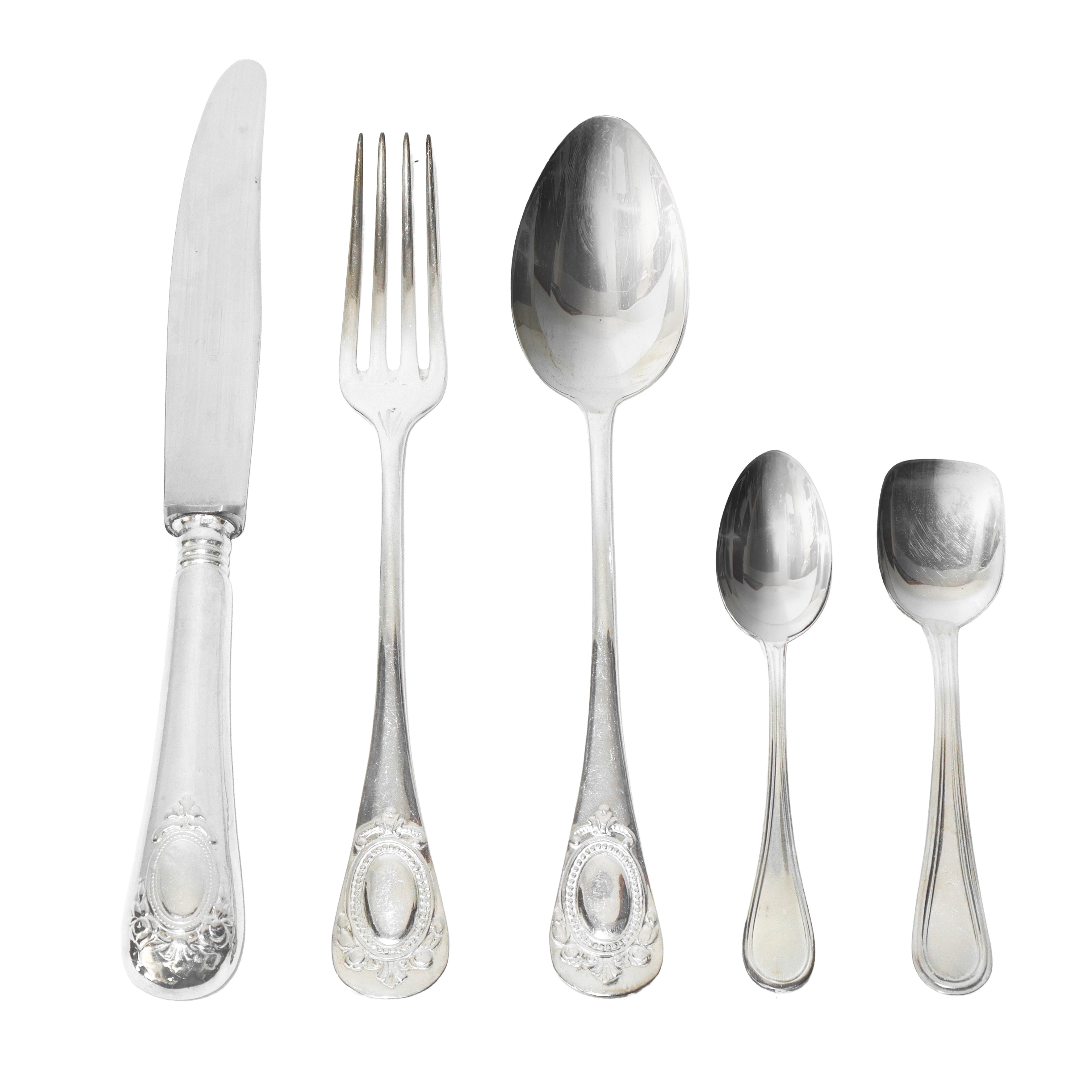 Gruppo composto da: 6 coltelli, 12 forchette, 12 cucchiai, 12 cucchiaini da gelato, 12 cucchiaini da caffè. I cucchiaini da caffè e i cucchiaini da gelato presentano un decoro differente rispetto a coltelli, forchette e cucchiai grandi che invece presentano il medesimo decoro.