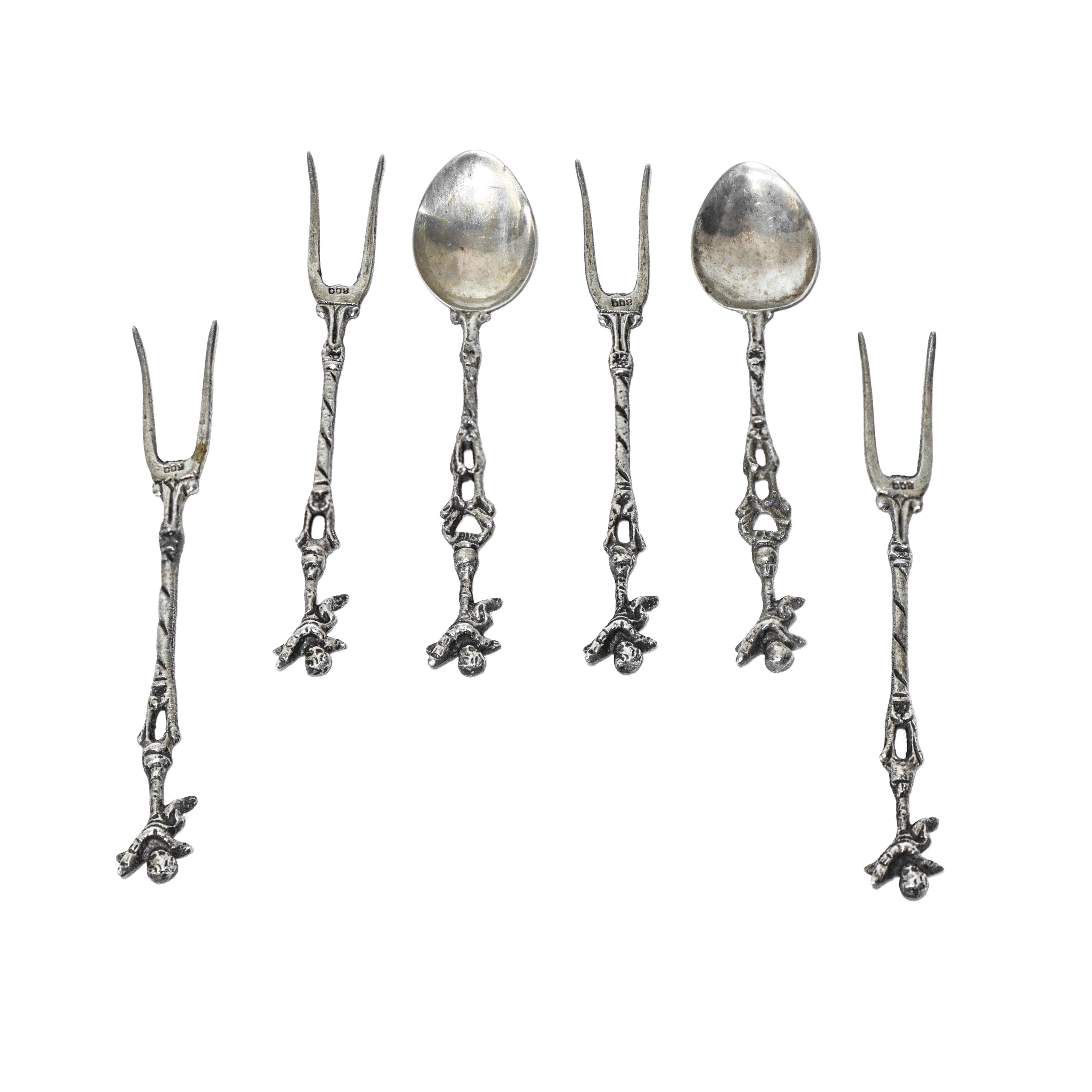 N 4 forchettine e 2 cucchiaini da aperitivo in argento 800 con putti