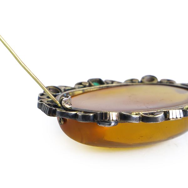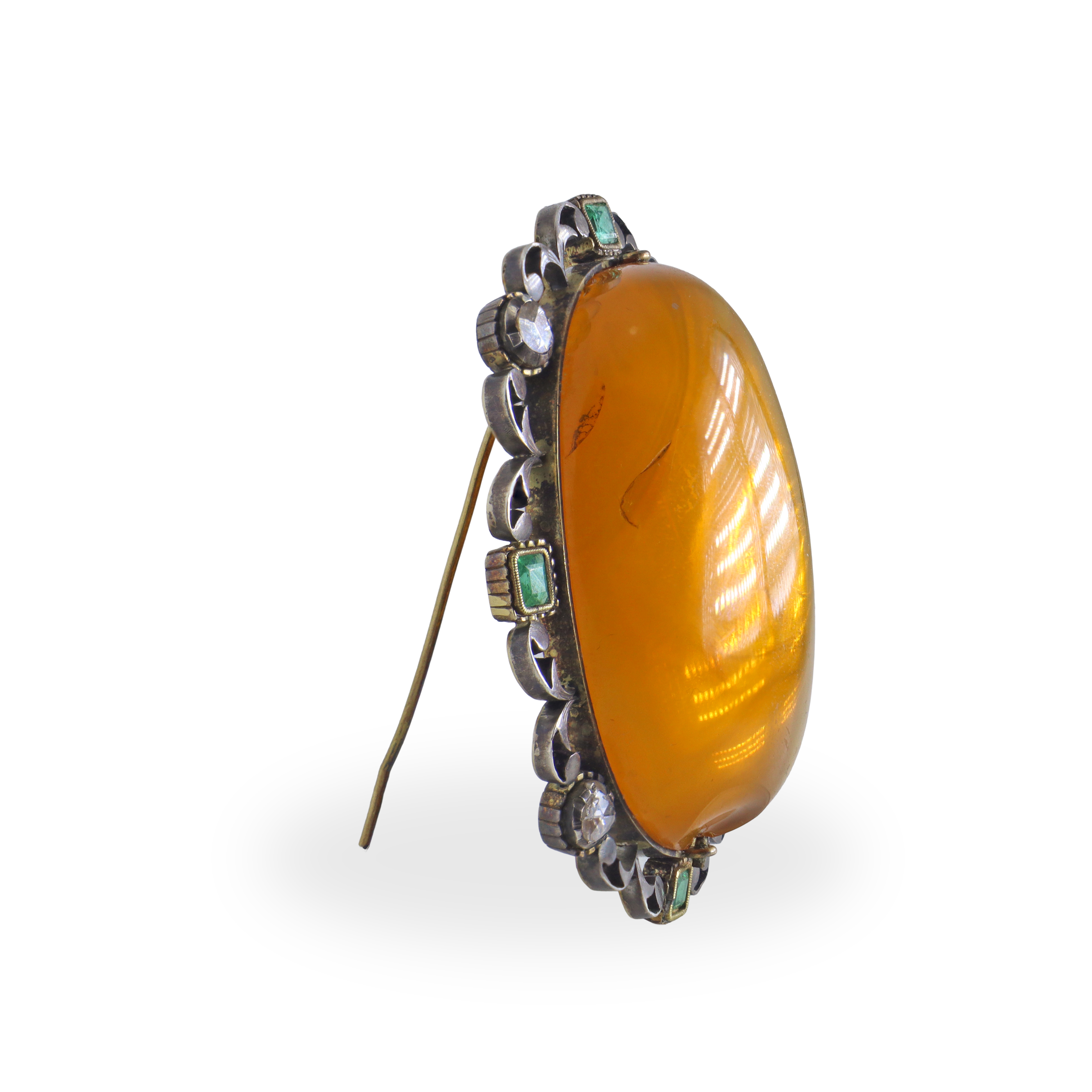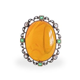 Spilla ovale in oro 750 e argento con ambra centrale e lungo il margine brillanti taglio antico e smeraldi quadrati