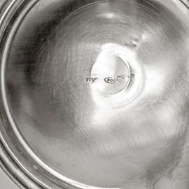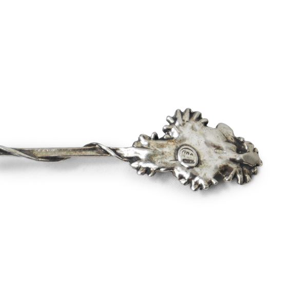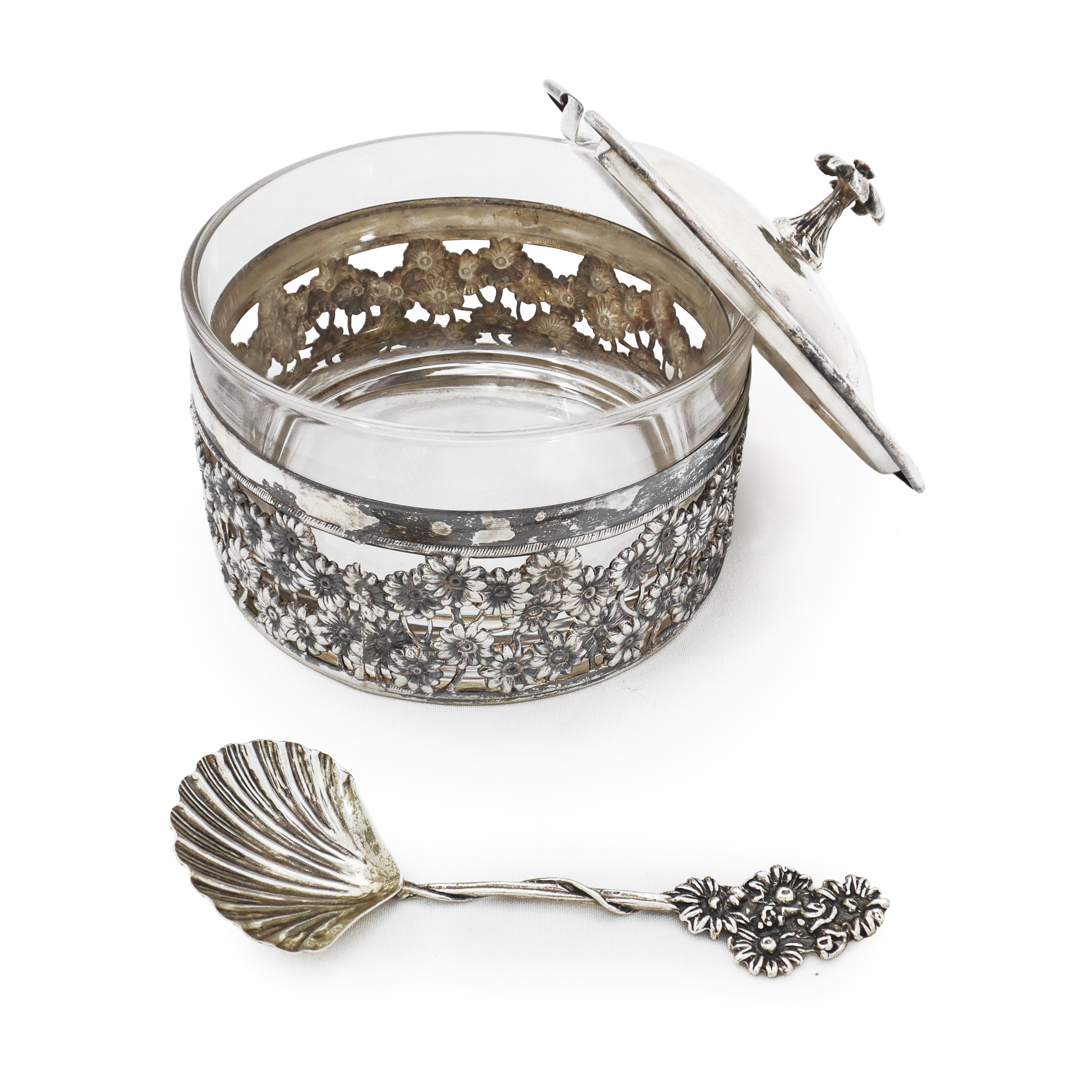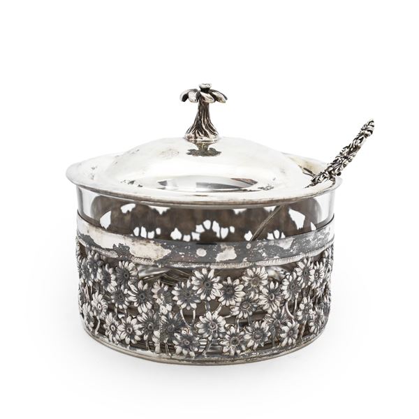 Zuccheriera in argento 800 con decoro floreale intarsiato in argento 800 ed interno in vetro