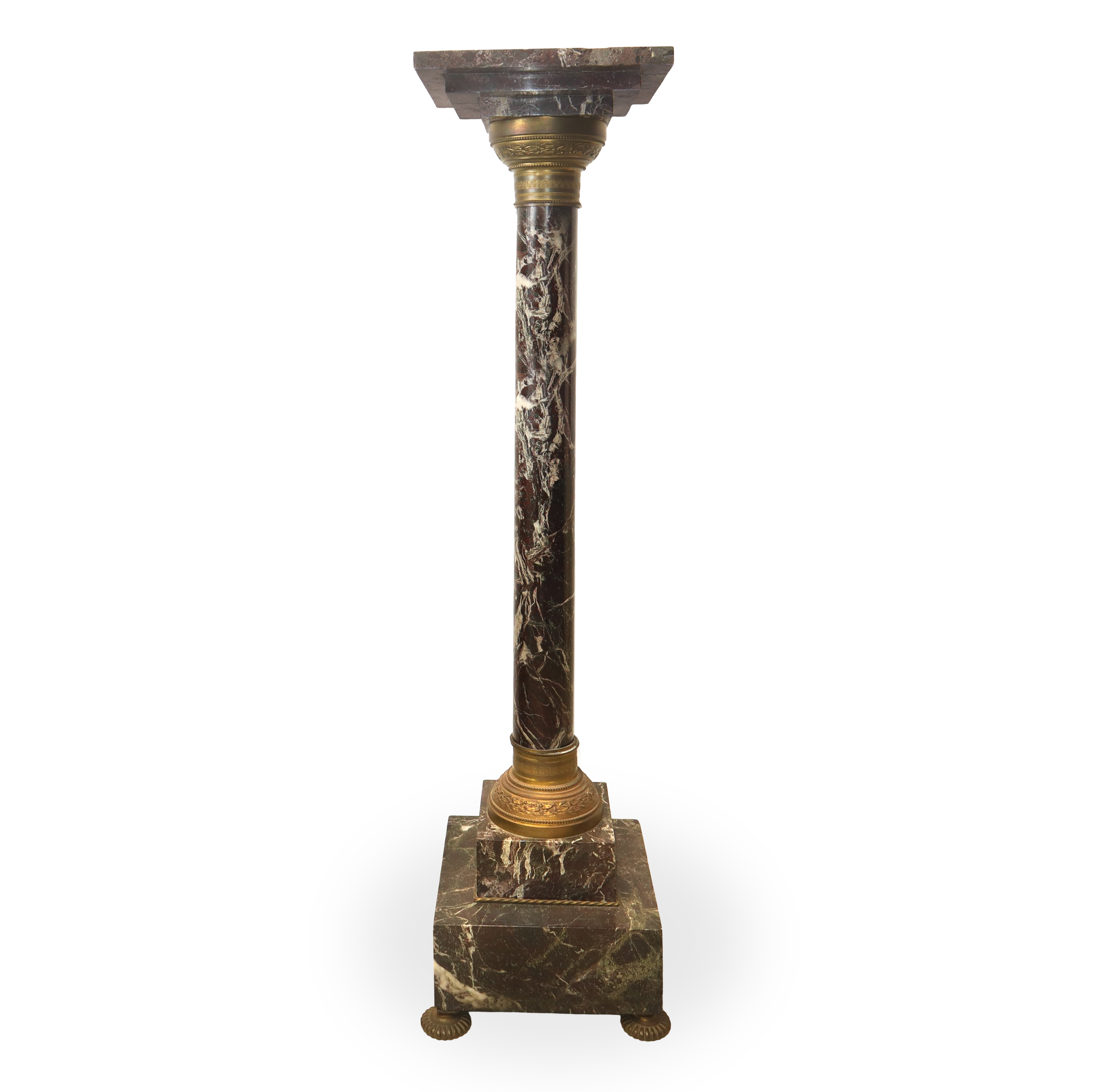 Colonna in marmo grigio con inserti in metallo dorato