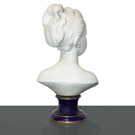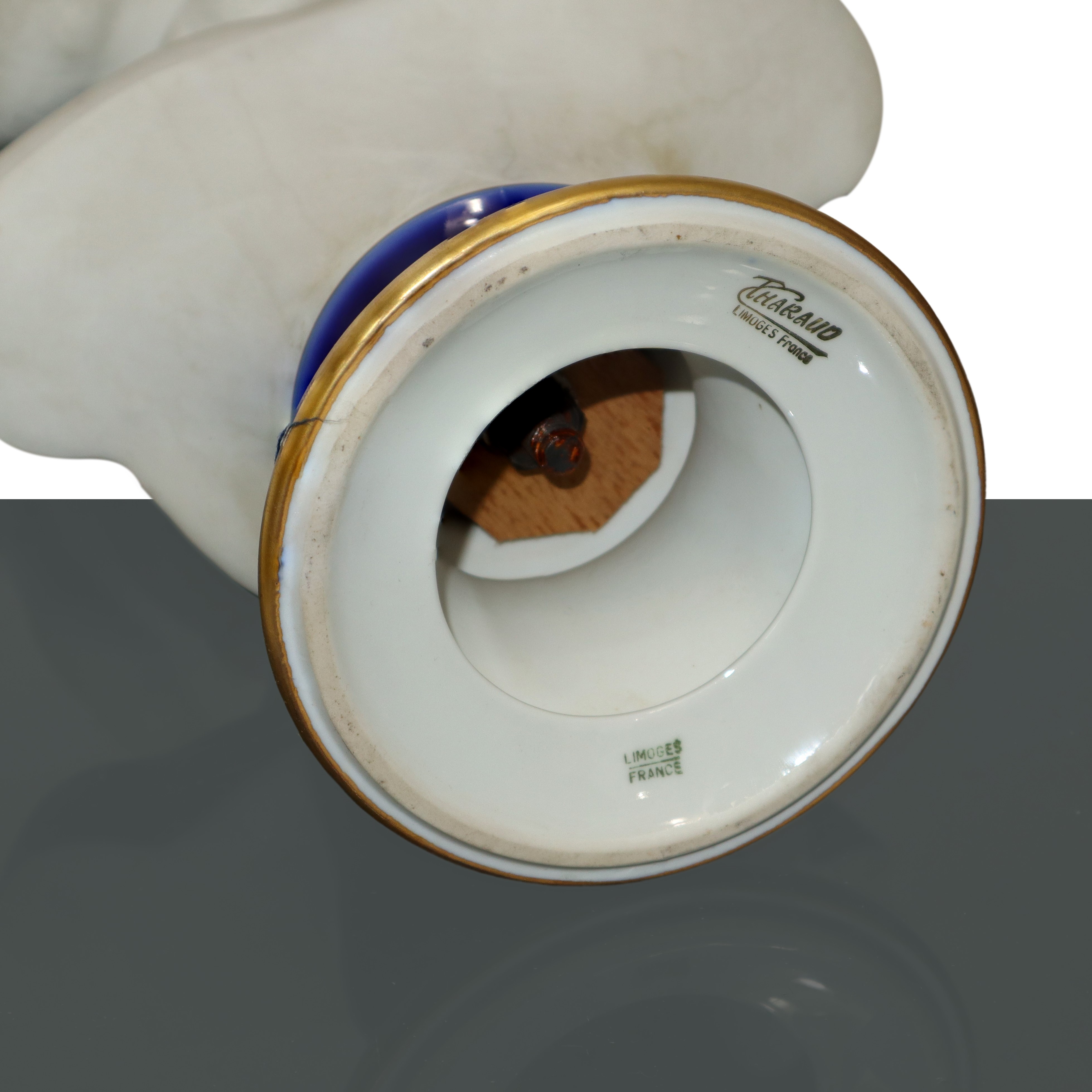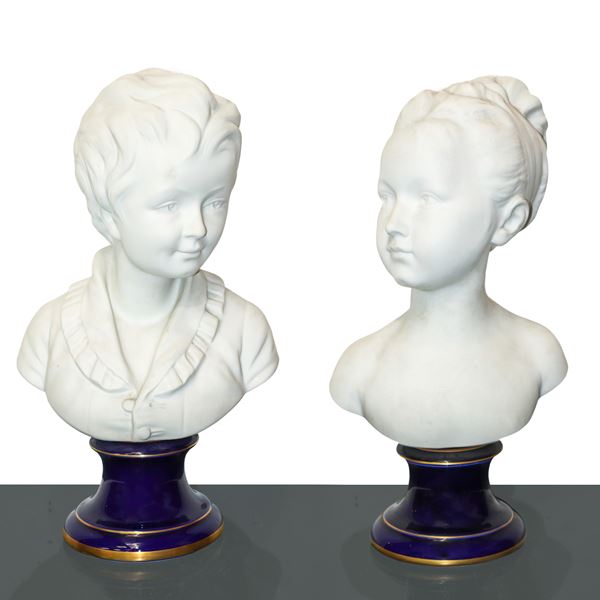 Coppia di fanciulli in biscuit bianco con base in porcellana blu, XX secolo