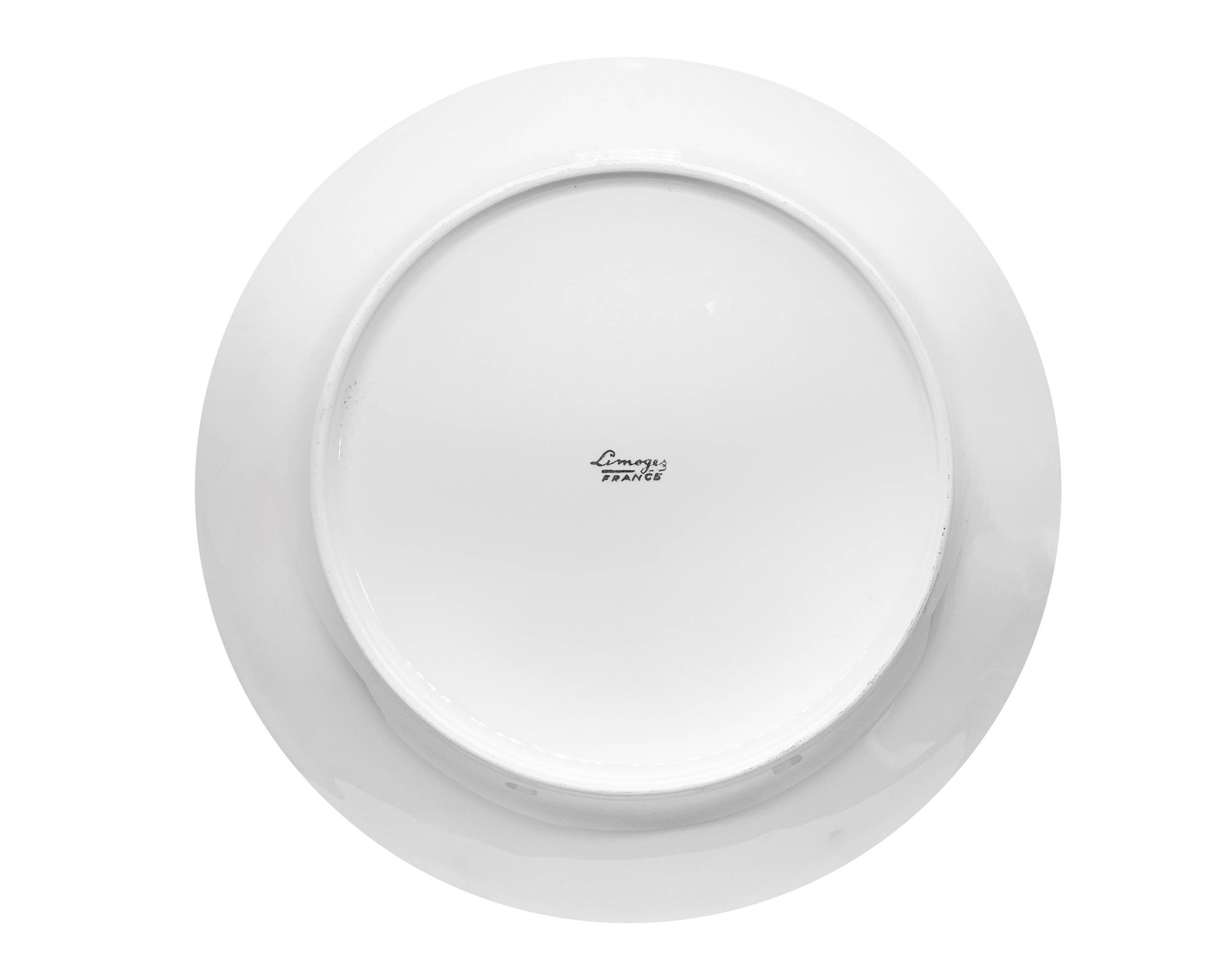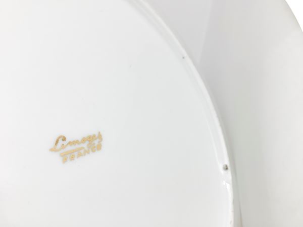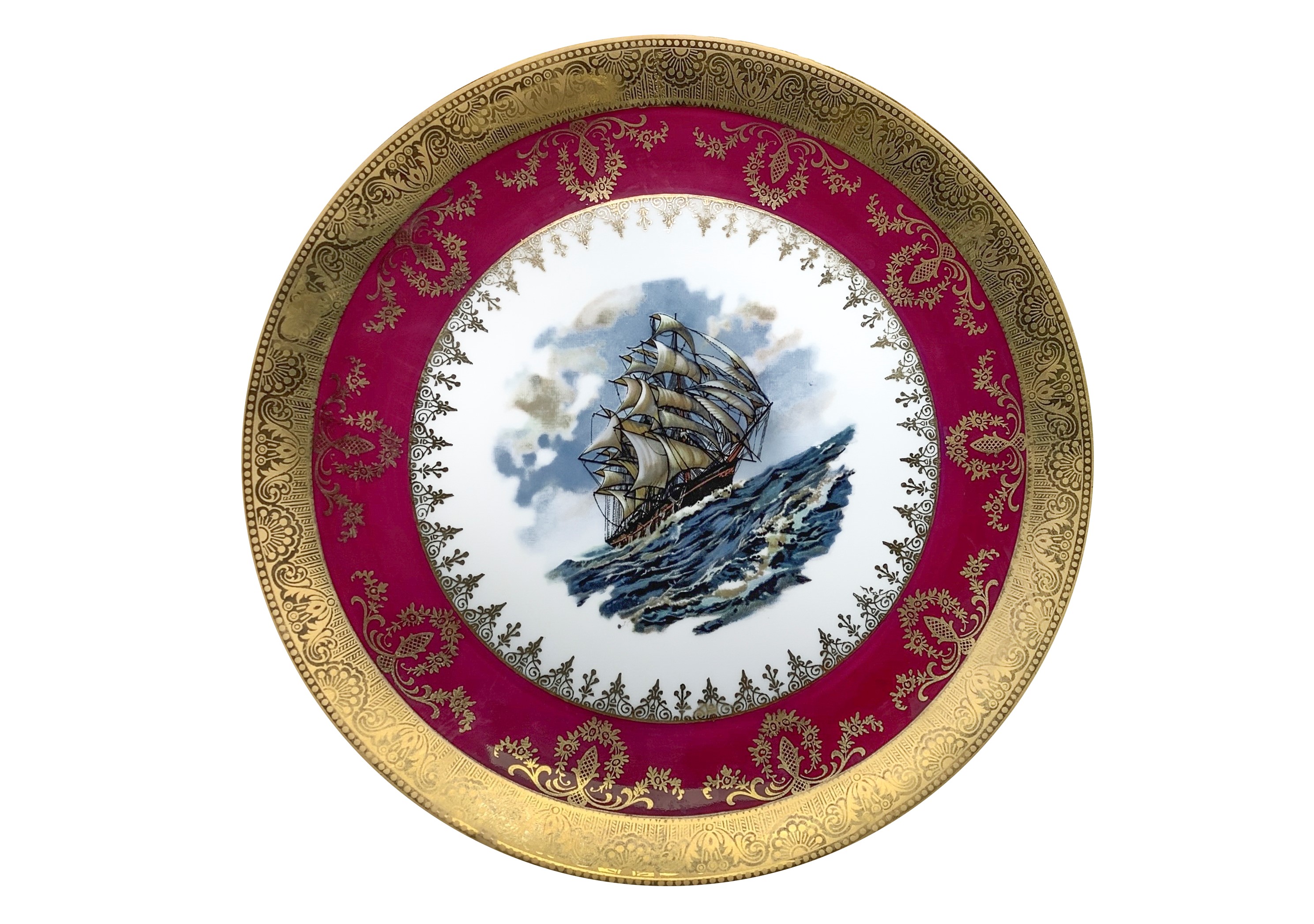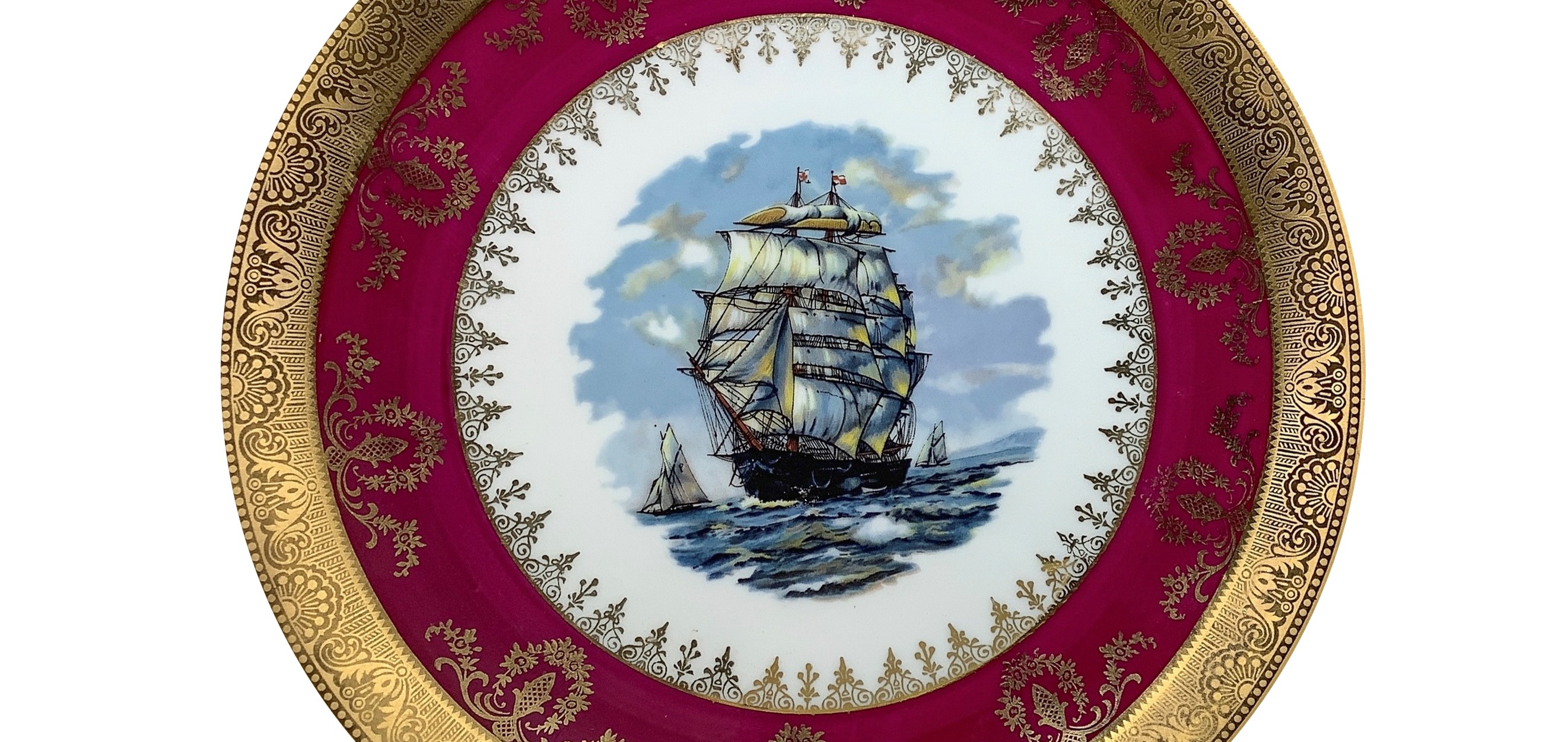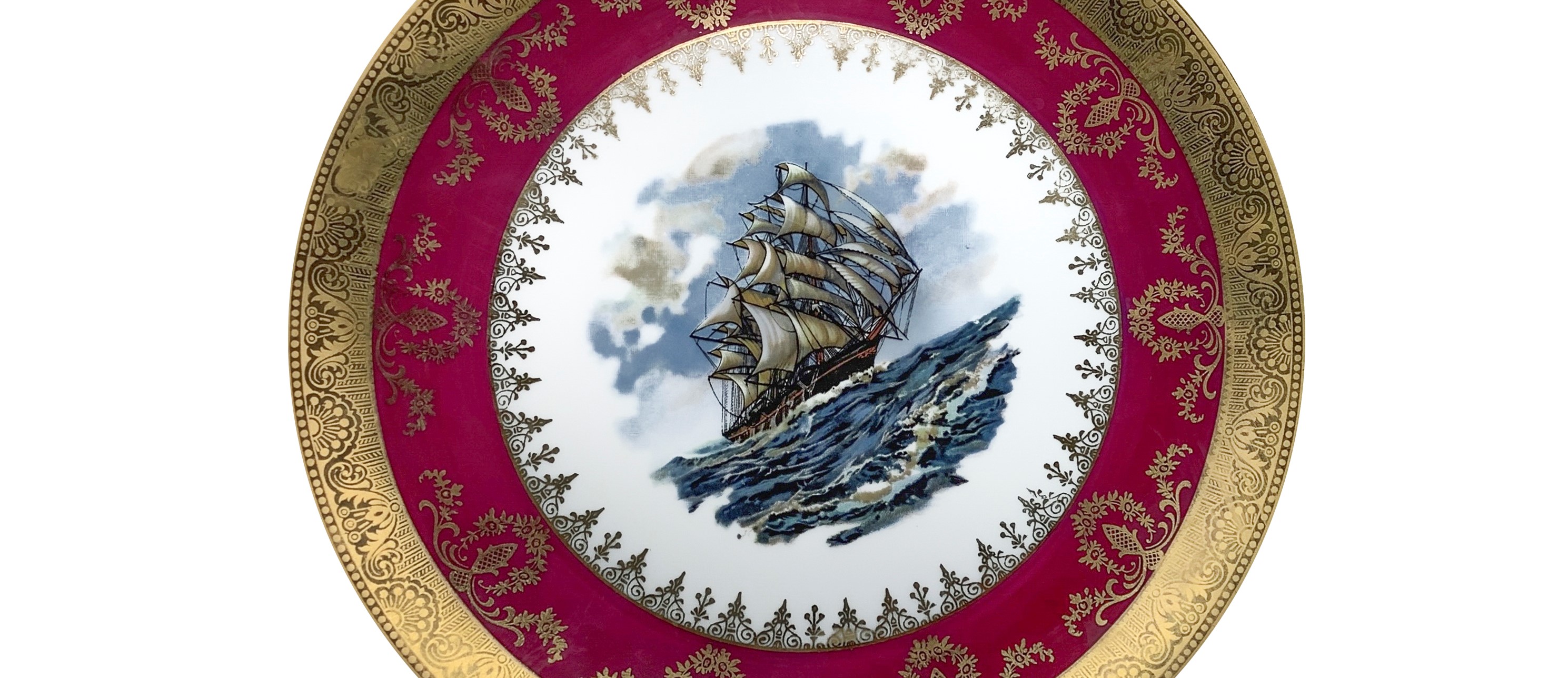 Coppia di piatti in porcellana bordeaux e oro con un galeone al centro