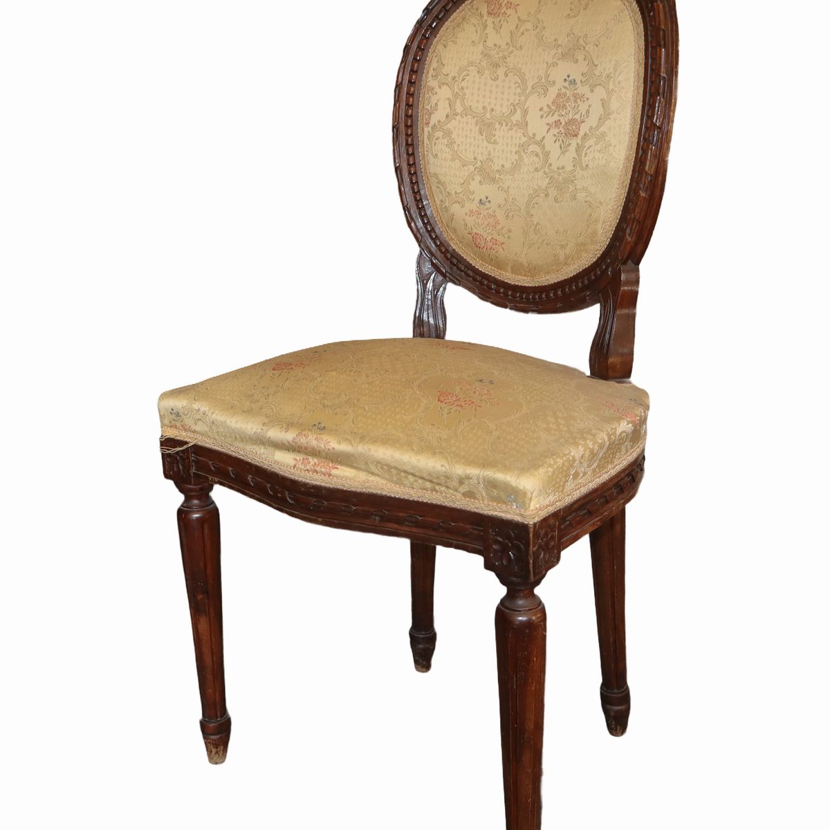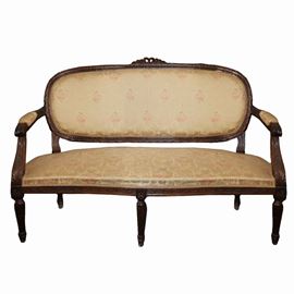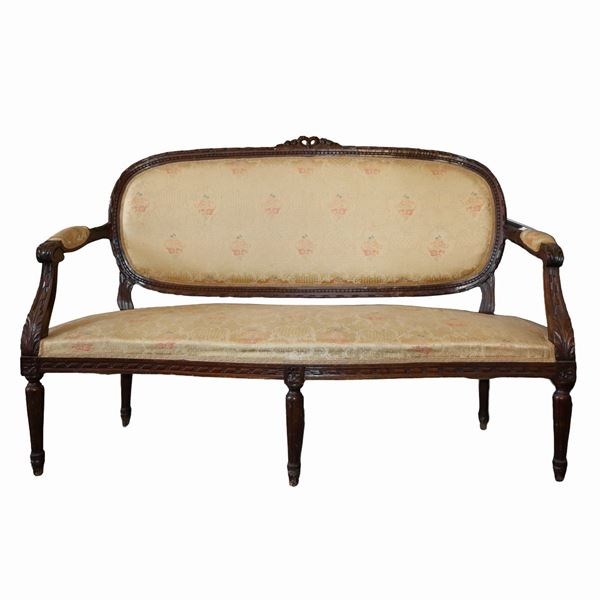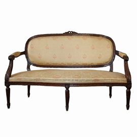 Salotto con braccioli intagliati a foglie d'acanto, gambe scanalate, tappezzaria damascata in stile floreale, Inizi XX secolo