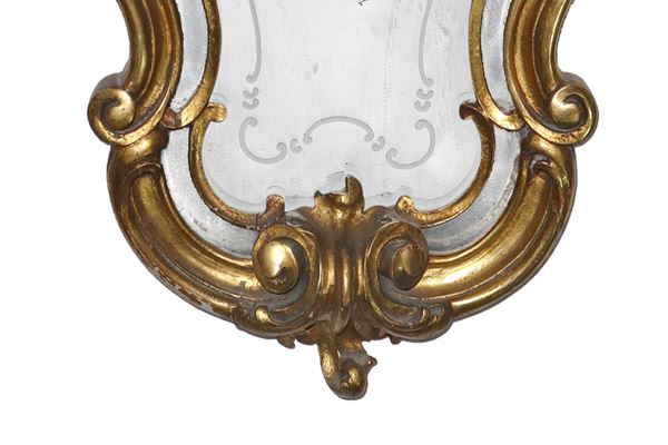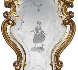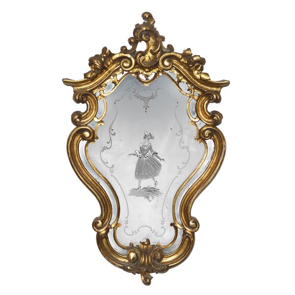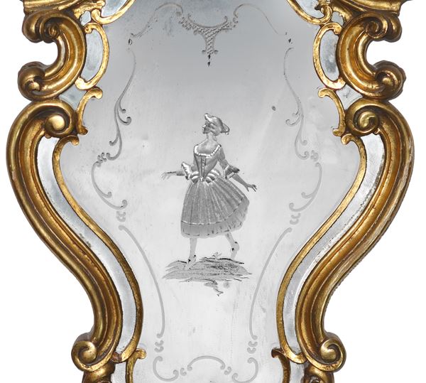 Specchiera decorativa in stile Rococò con figuretta femminile entro cornice dorata riccamente decorata, Venezia, XX sec.