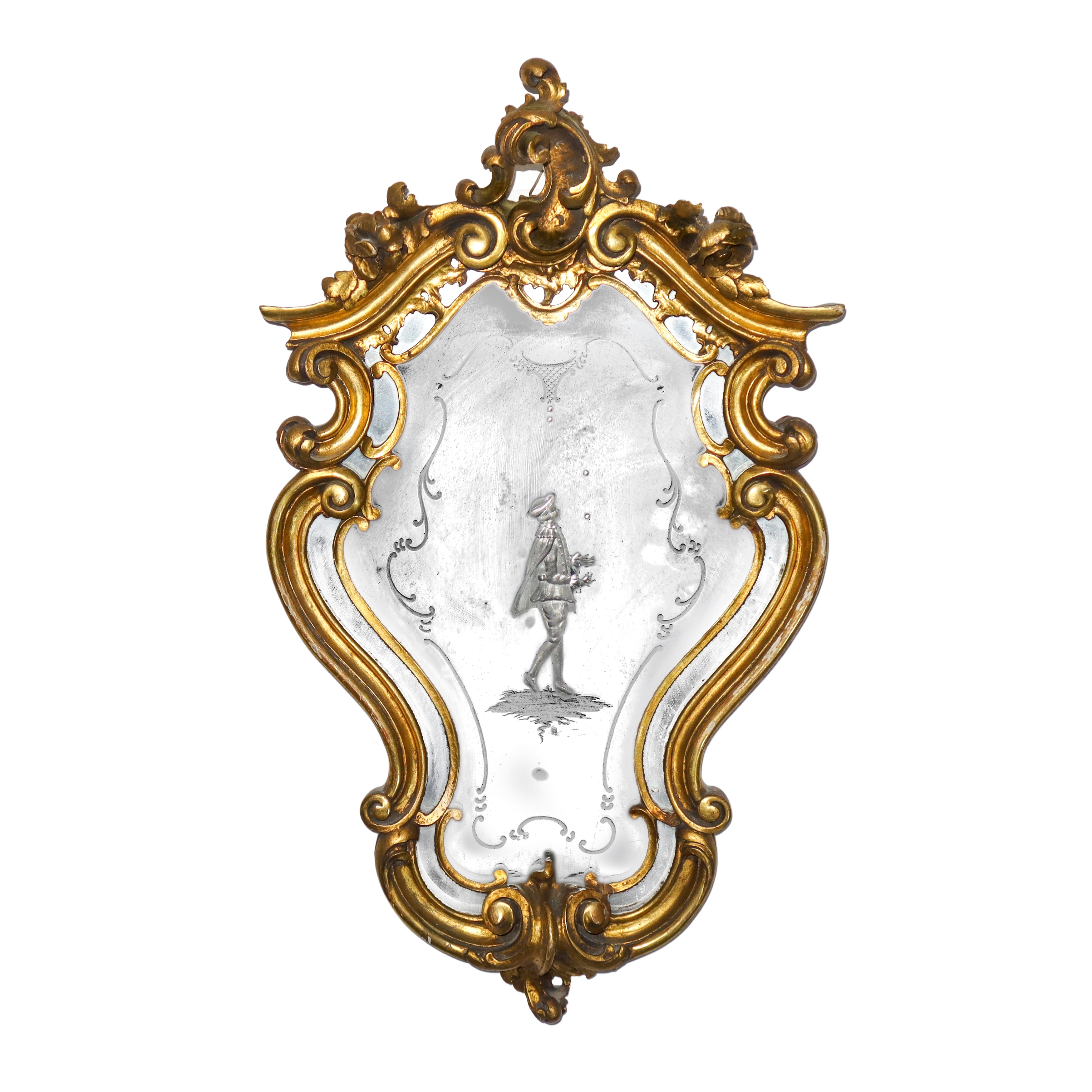 Specchiera decorativa in stile Rococò con figuretta maschile entro cornice dorata riccamente decorata, Venezia, XX sec.