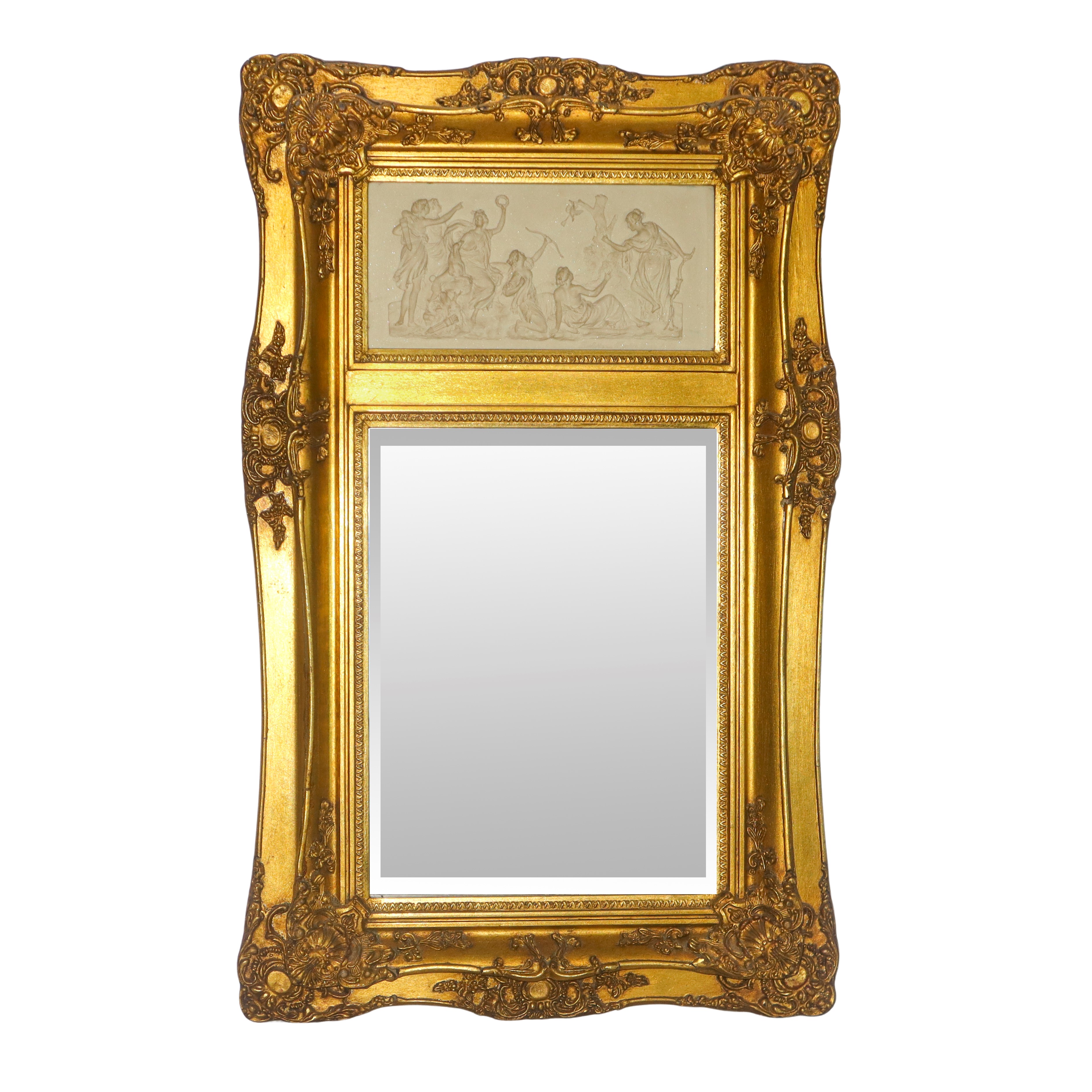 Specchiera entro cornice dorata con decori e bassorilievo neoclassico, XX sec.