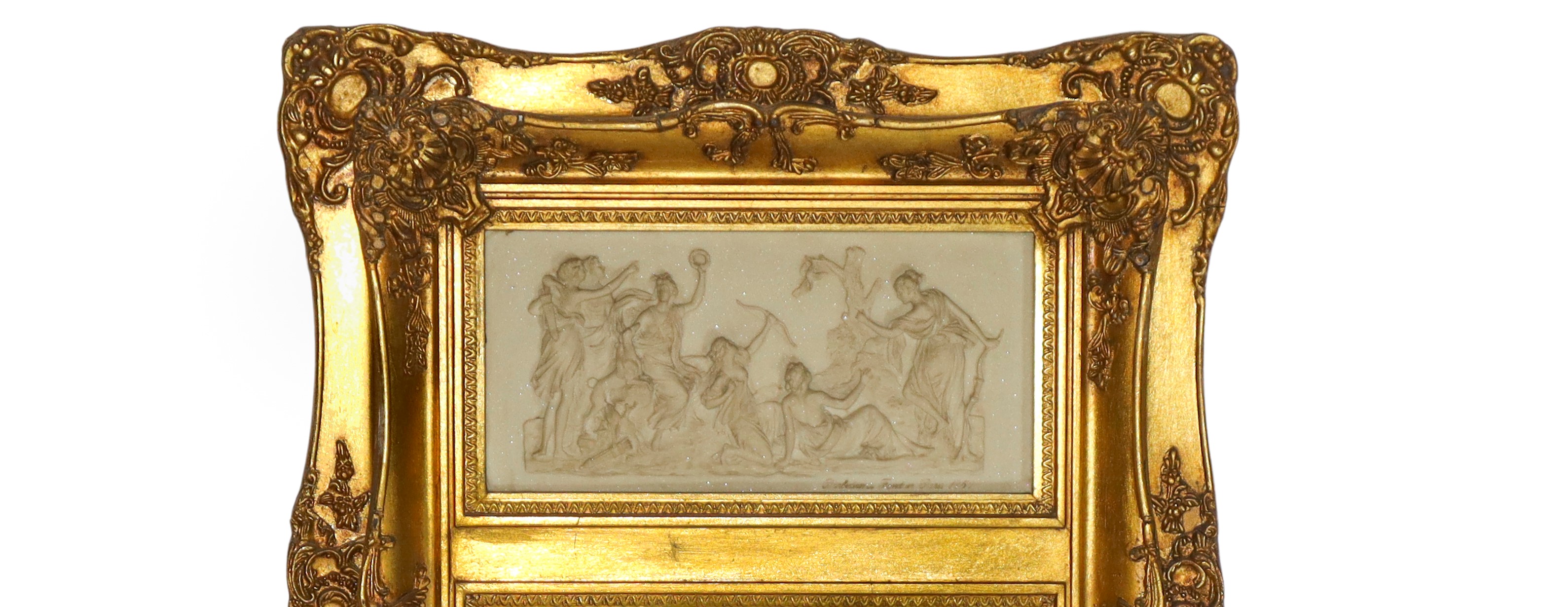 Specchiera entro cornice dorata con decori e bassorilievo neoclassico, XX sec.