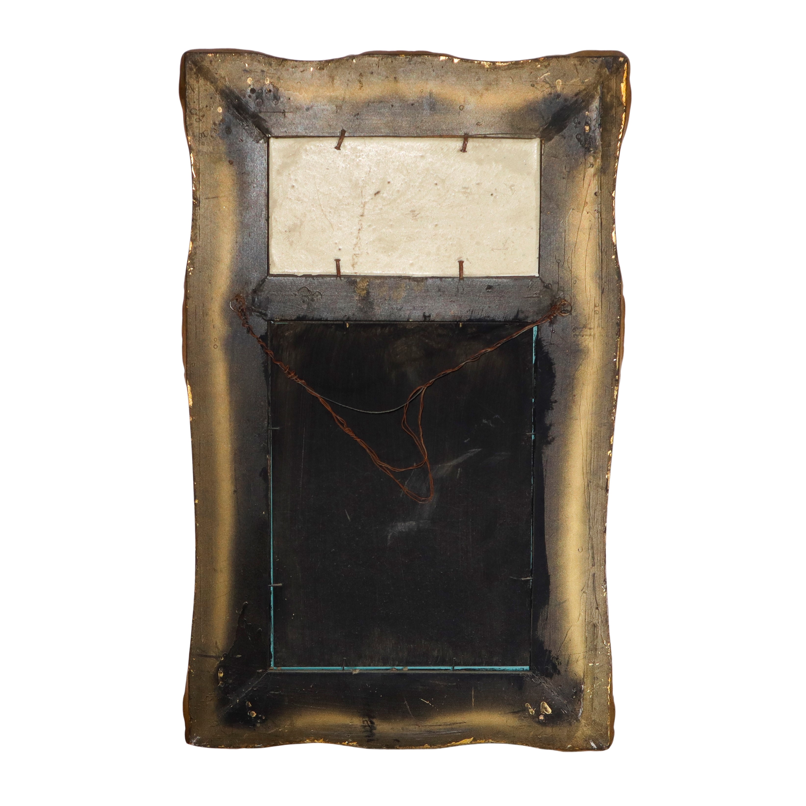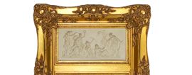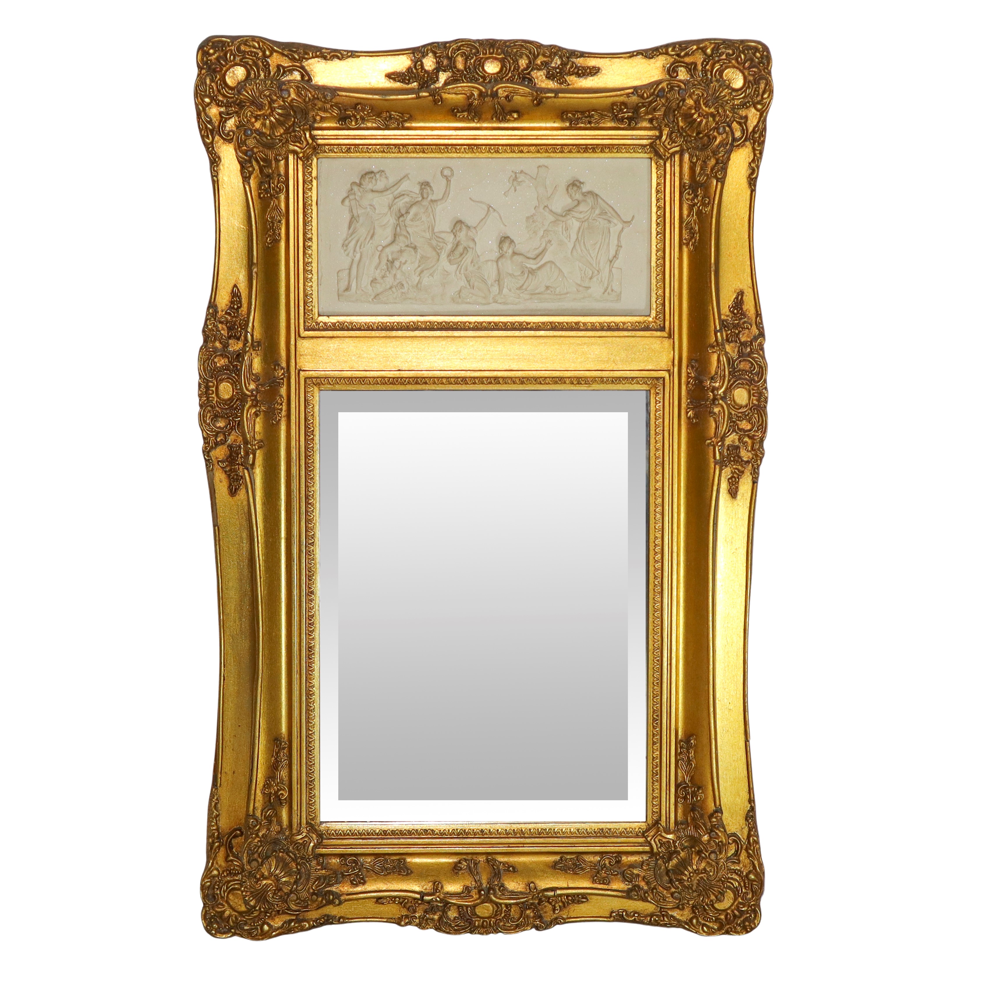 Specchiera entro cornice dorata con decori e bassorilievo neoclassico, XX sec.