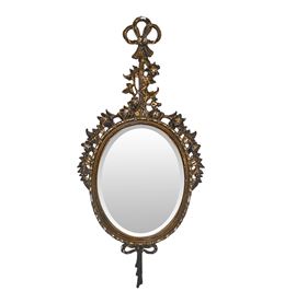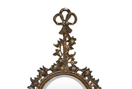 Specchiera ovale entro cornice dorata con decori floreali e fiocchi pendenti alla sommità e alla base, XX sec.