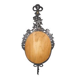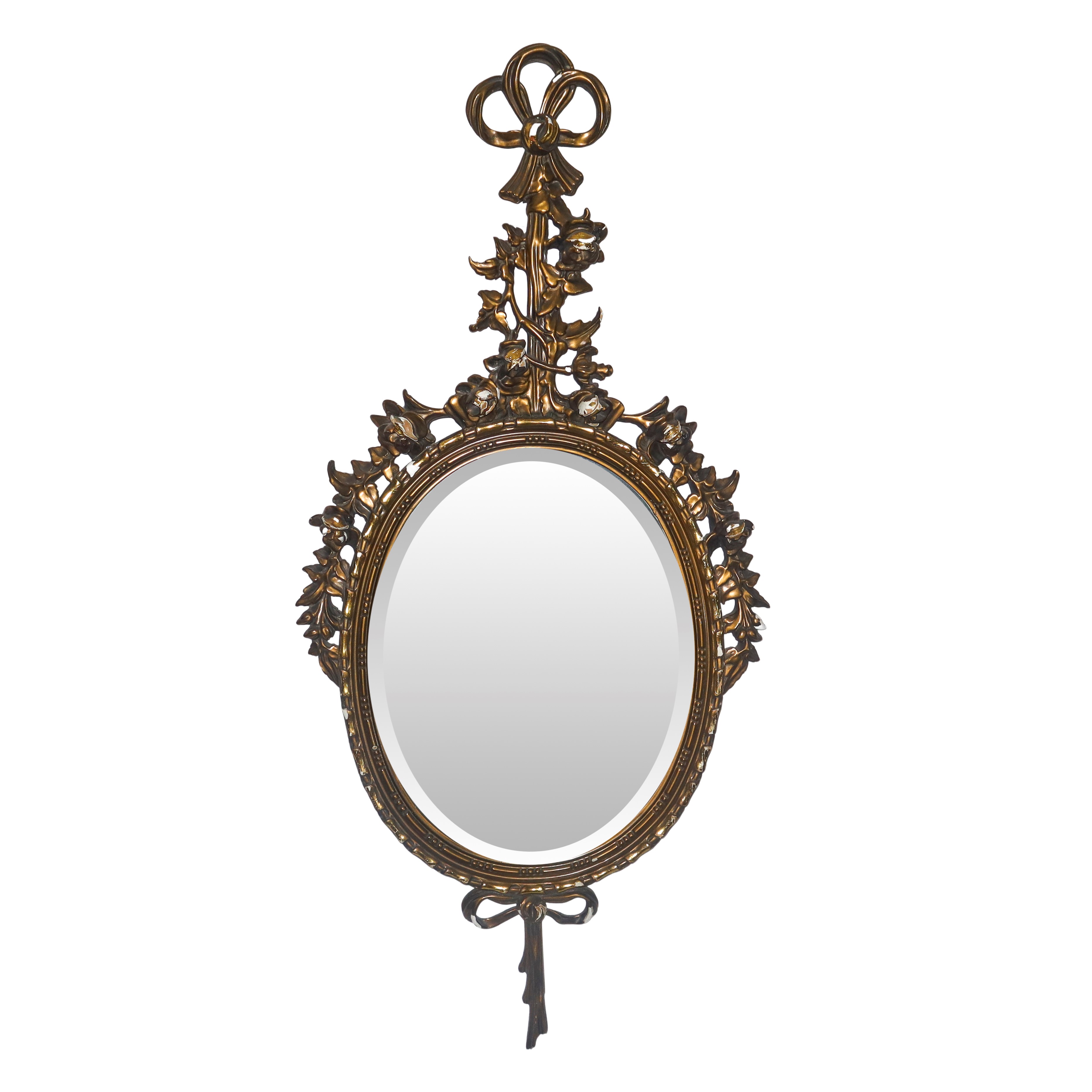 Specchiera ovale entro cornice dorata con decori floreali e fiocchi pendenti alla sommità e alla base, XX sec.