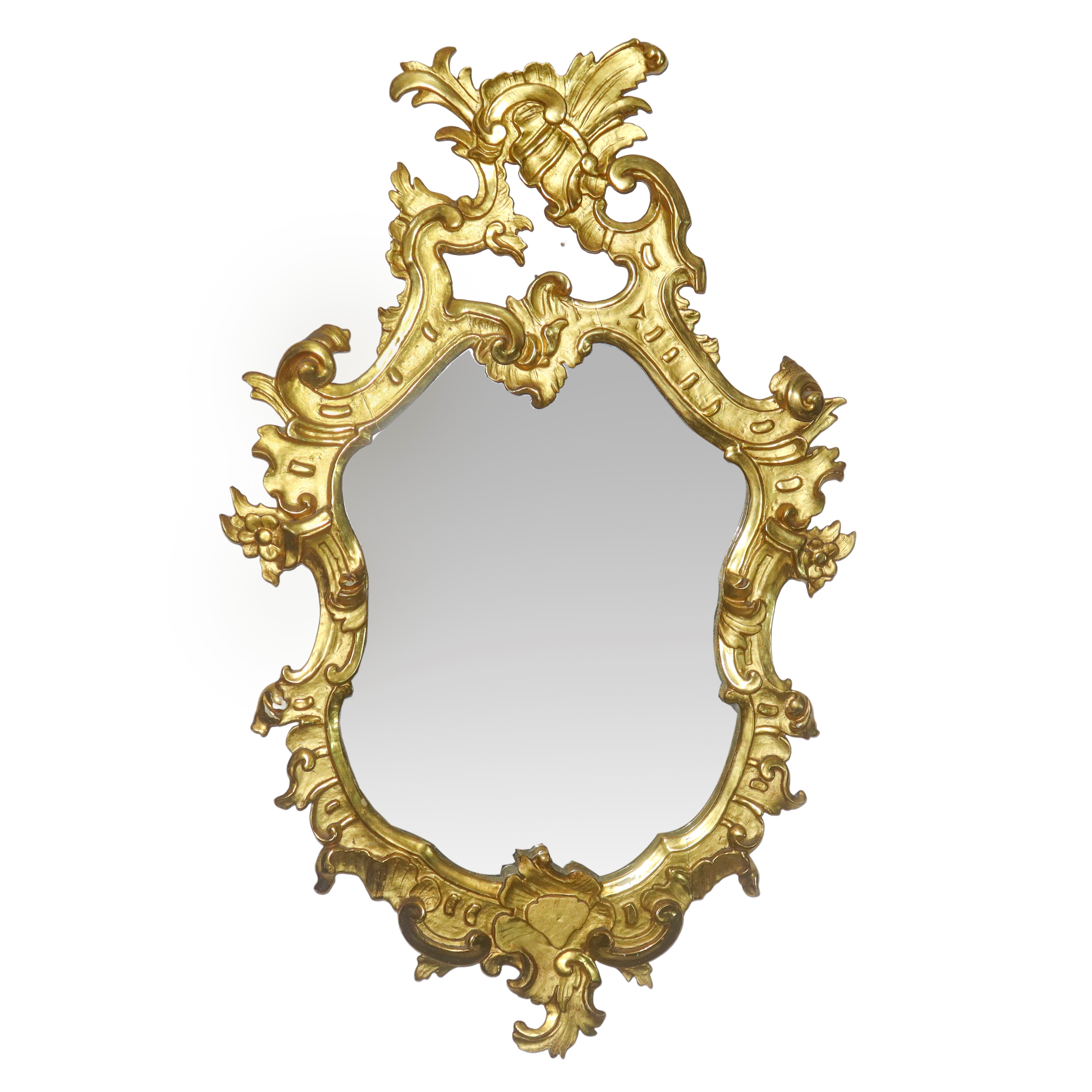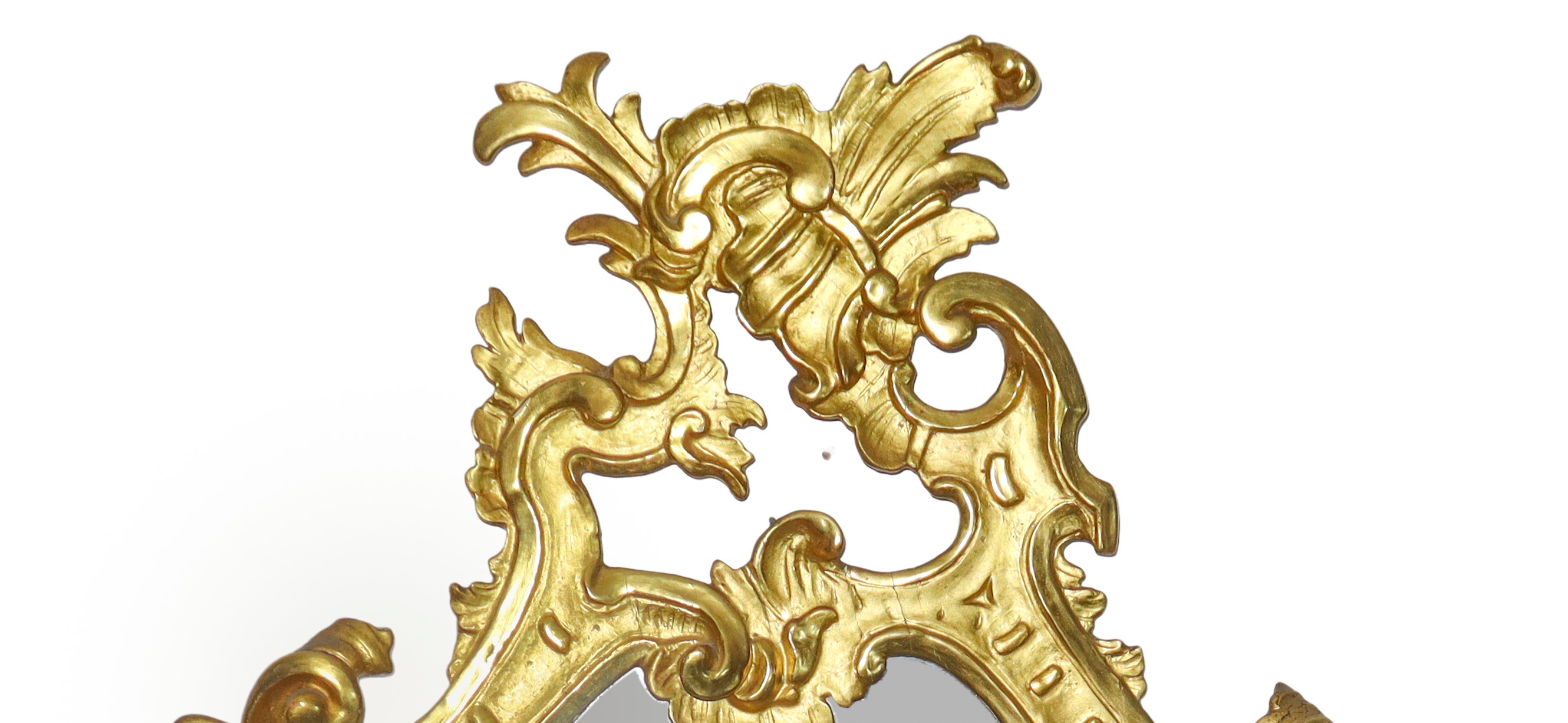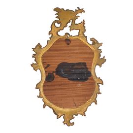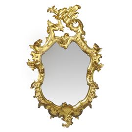 Specchiera sagomata entro cornice dorata con decoro traforato alla sommità, XX sec.