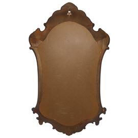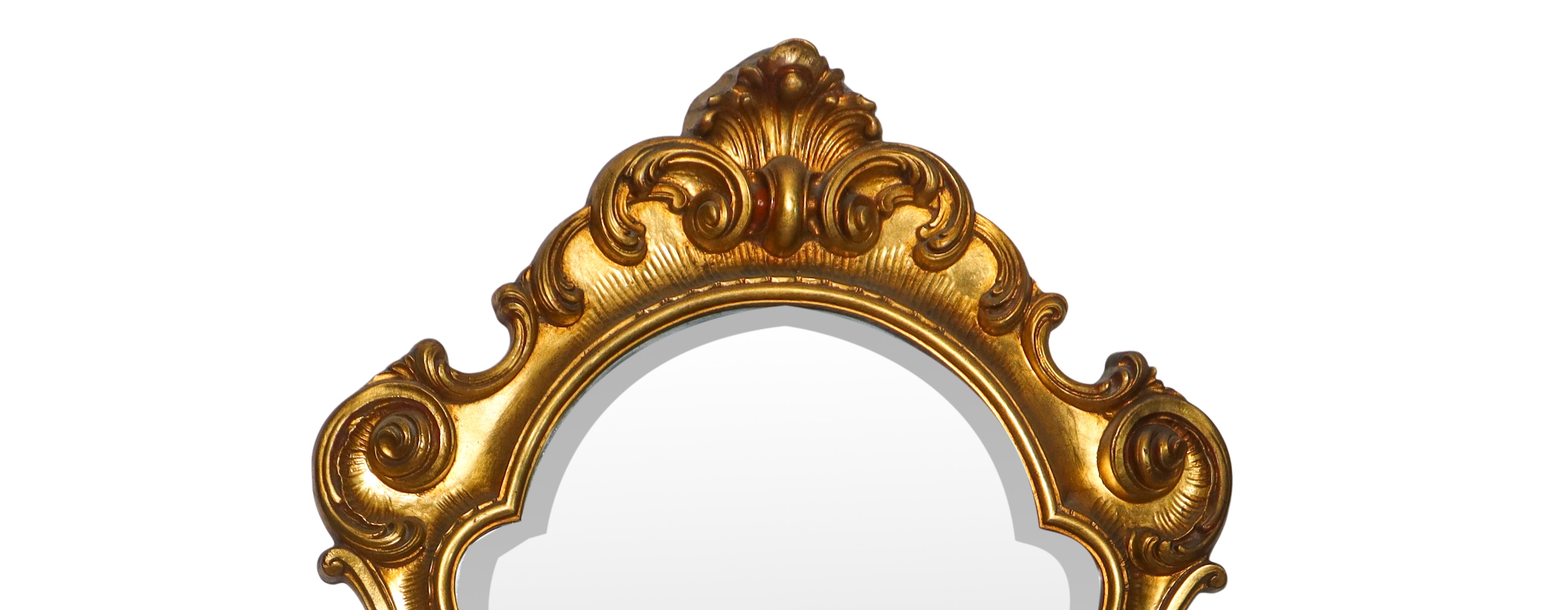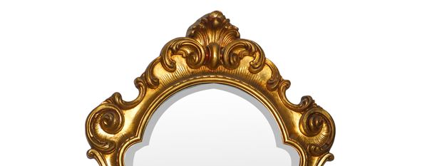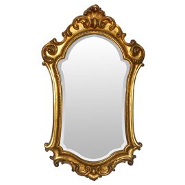 Specchiera sagomata entro cornice dorata decorata alla sommità e alla base con con spirali d'acanto, XX sec.