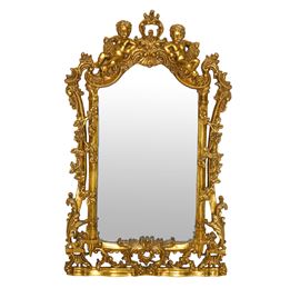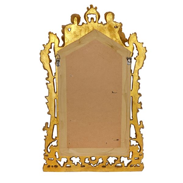 Specchiera sagomata entro cornice dorata riccamente decorata a traforo con due bacchini alla sommità, XX sec.