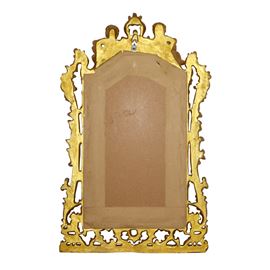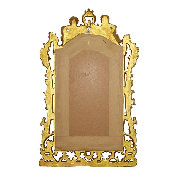Specchiera sagomata entro cornice dorata riccamente decorata a traforo con due bacchini alla sommità, XX sec.