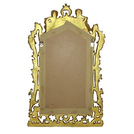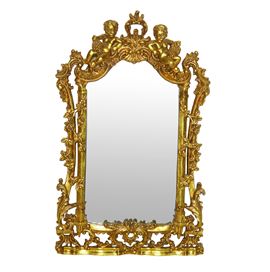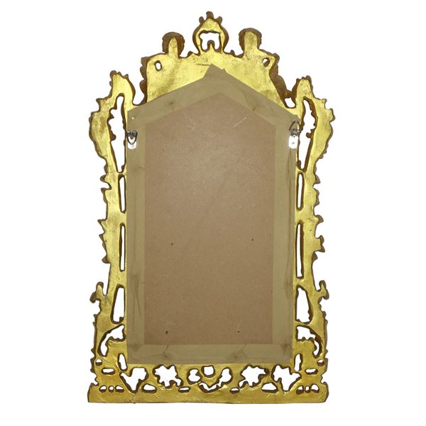 Specchiera sagomata entro cornice dorata riccamente decorata a traforo con due bacchini alla sommità, XX sec.