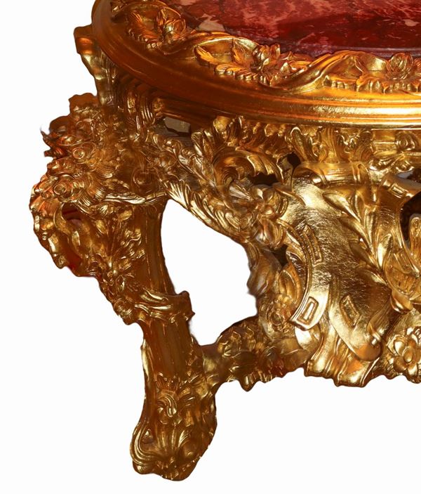 , struttura in legno dorato nello stile barocco, N°3 piedi con legacci convergenti al centro, grande festone al sottopiano, perfette condizioni.