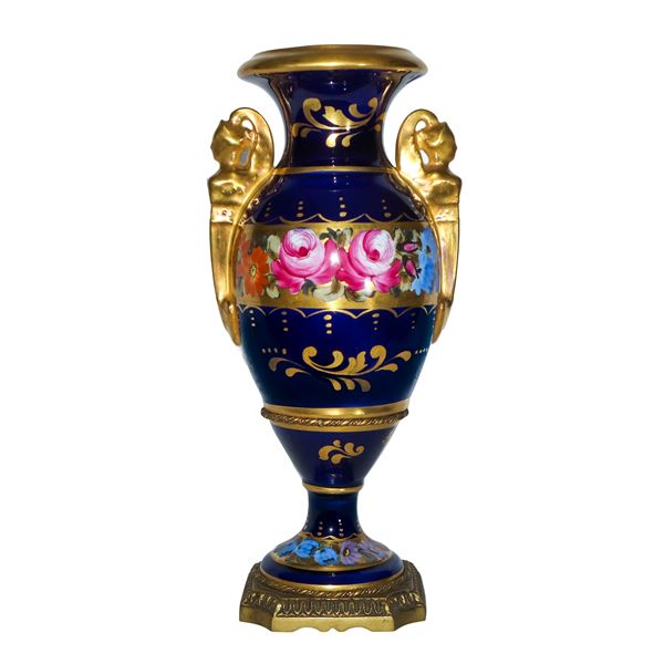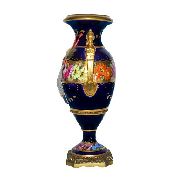 Vaso ad anfora blu con decori dorati e fiori, XX sec.