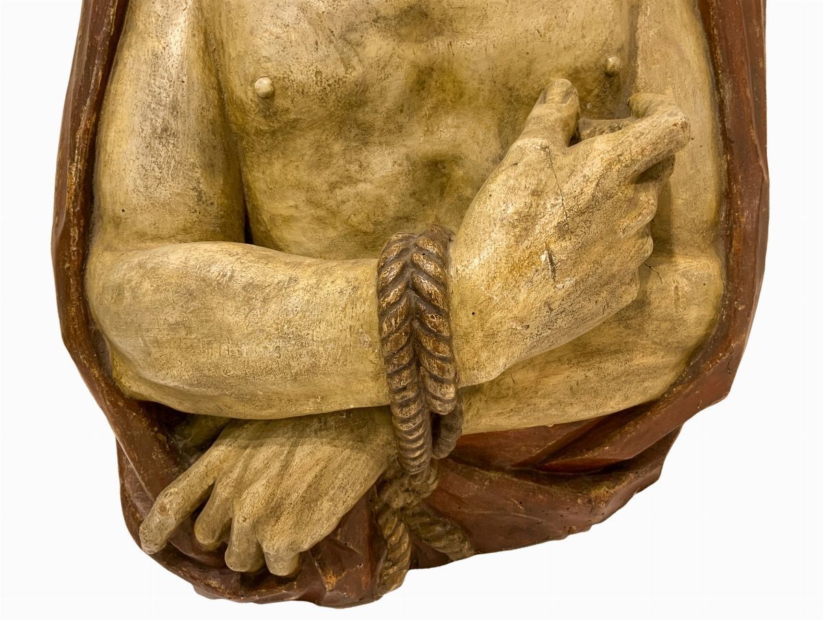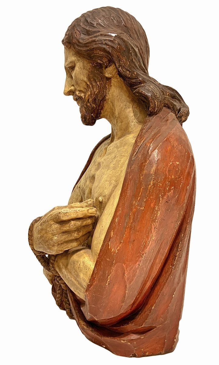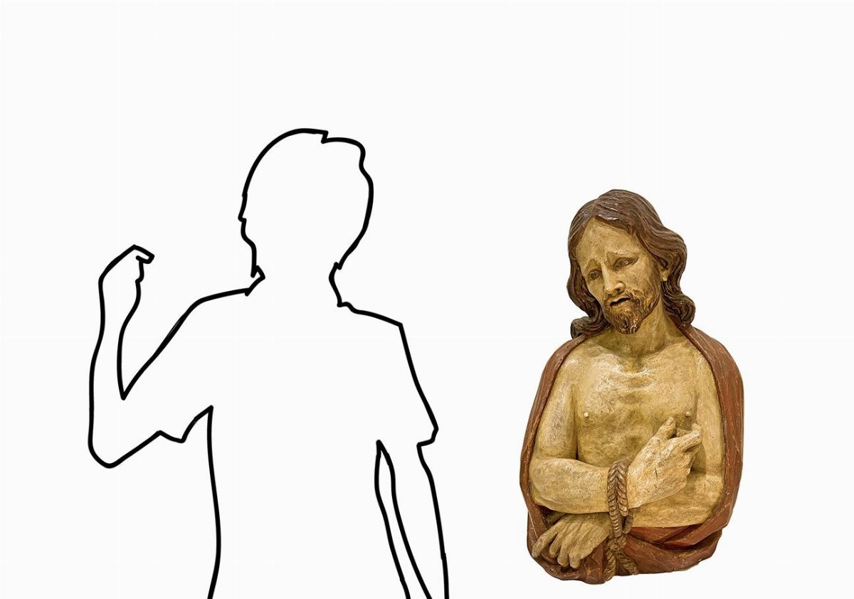Scultura lignea policroma a mezzo busto. Quest'opera resa espressiva con estremo realismo psicologico, mostra il Cristo nel momento in cui, secondo il Vangelo di Giovanni, Ponzio Pilato - governatore di Roma - mostra alla folla il Cristo pronunciando la famosa frase “Ecce Homo”.L scultura, realizzata in legno, tecnicamente secondo l'uso Altomedievale, è stata svuotata del midollo interno per far si che col tempo non si manifestassero crepe e fessurazioni.L'opera è molto semplice nella struttura scultorea ed è tutta volta alla rappresentazione, soprattutto del viso leggermente inclinato verso il basso e nell’eccezionale costruzione delle mani legate.L’inteso patetismo viene espresso dal viso che è rivolto verso l'osservatore. Sembra che susciti e accresca il potere drammatico come se avanti all'opera ci fosse la folla che gli sta innanzi nel momento in cui Pilato doveva esprimere il suo giudizio. Inoltre le mani legate sembrano indicarci la condizione del Cristo, infatti la mano destra ha l'indice rivolto verso se stesso, come a volerci spingere ad osservare lo stato in cui Egli è stato ridotto per salvare l'umanità intera.Questi atteggiamenti sono i tempi compositivi basilari di questa scultura che, in tal modo, adempie alla massima focalizzazione di un realismo psicologico prescindendo dai volumi e dalle forme che pur sono ottimali. ASOR studio