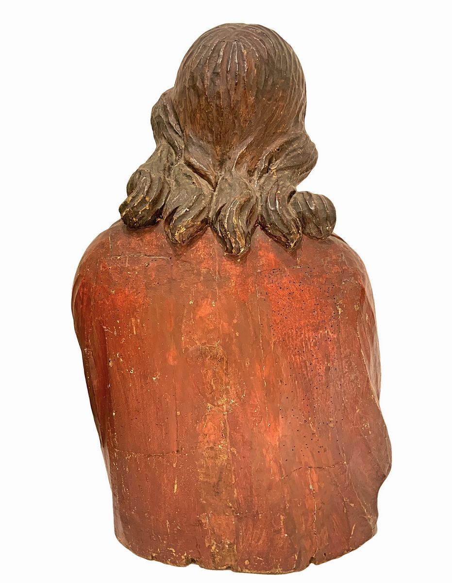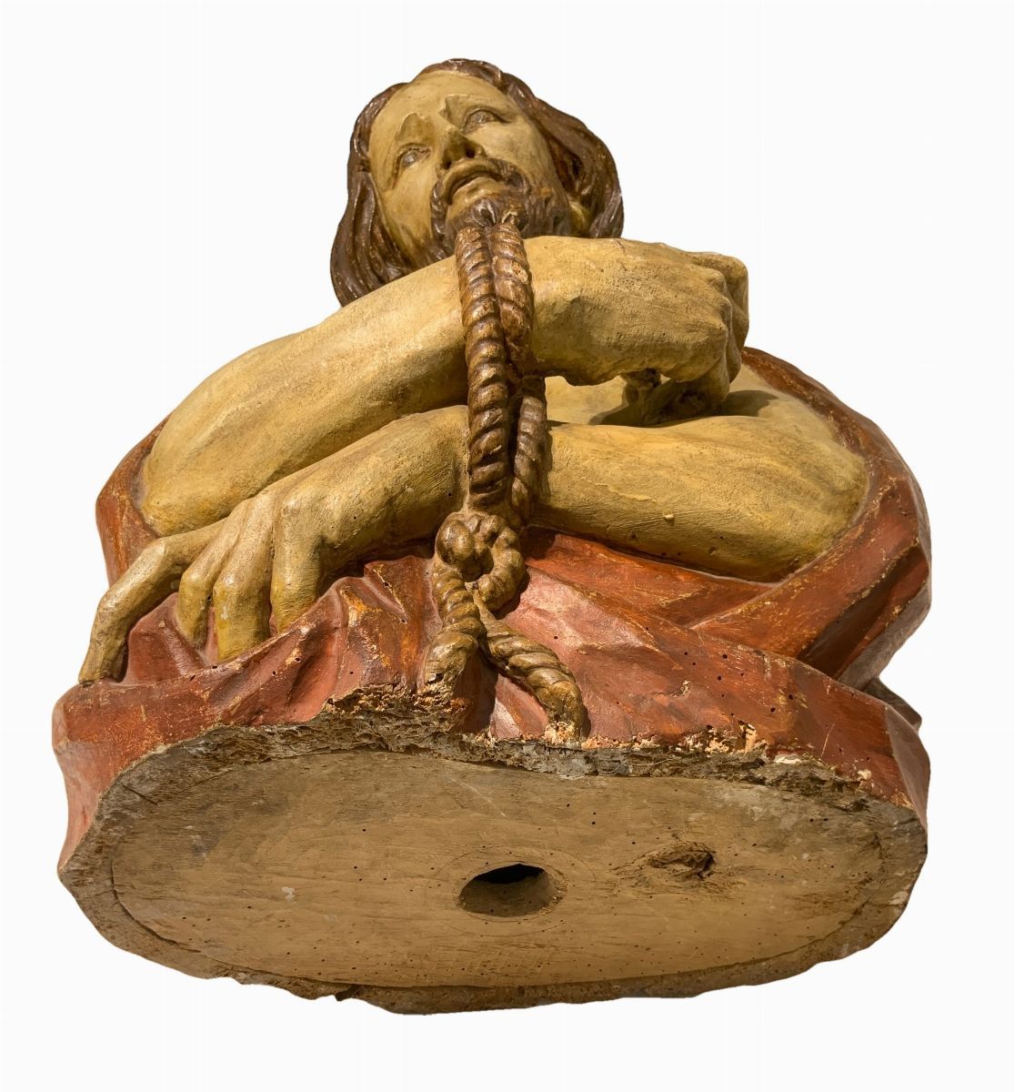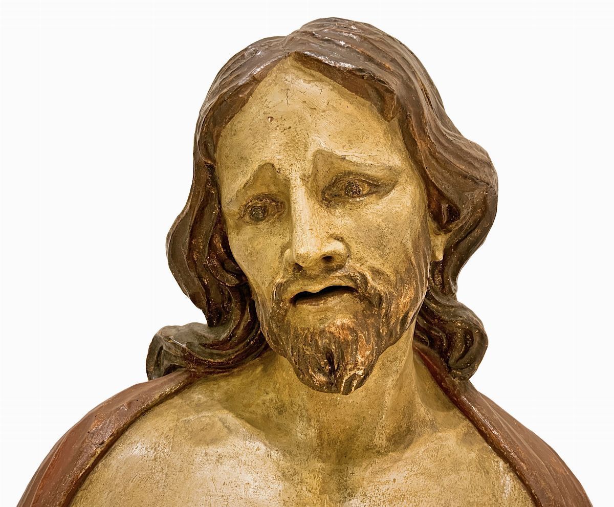 Scultura lignea policroma a mezzo busto. Quest'opera resa espressiva con estremo realismo psicologico, mostra il Cristo nel momento in cui, secondo il Vangelo di Giovanni, Ponzio Pilato - governatore di Roma - mostra alla folla il Cristo pronunciando la famosa frase “Ecce Homo”.L scultura, realizzata in legno, tecnicamente secondo l'uso Altomedievale, è stata svuotata del midollo interno per far si che col tempo non si manifestassero crepe e fessurazioni.L'opera è molto semplice nella struttura scultorea ed è tutta volta alla rappresentazione, soprattutto del viso leggermente inclinato verso il basso e nell’eccezionale costruzione delle mani legate.L’inteso patetismo viene espresso dal viso che è rivolto verso l'osservatore. Sembra che susciti e accresca il potere drammatico come se avanti all'opera ci fosse la folla che gli sta innanzi nel momento in cui Pilato doveva esprimere il suo giudizio. Inoltre le mani legate sembrano indicarci la condizione del Cristo, infatti la mano destra ha l'indice rivolto verso se stesso, come a volerci spingere ad osservare lo stato in cui Egli è stato ridotto per salvare l'umanità intera.Questi atteggiamenti sono i tempi compositivi basilari di questa scultura che, in tal modo, adempie alla massima focalizzazione di un realismo psicologico prescindendo dai volumi e dalle forme che pur sono ottimali. ASOR studio