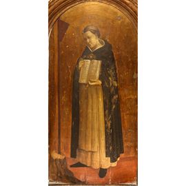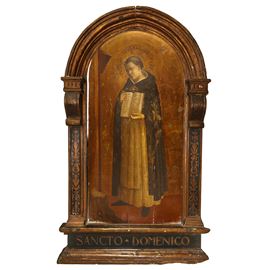 La bella edicola lignea ritrae San Domenico che mostra le Sacre Scritture. La tavola, distinta per l'alta qualità pittorica e la morbidezza nella resa del viso del Santo, è dipinta su fondo oro con aureola punzonata a imitazione dello stile italiano della prima metà del XV sec. La cornice è decorata con mensoline ed intarsi floreali ma presenta alcune rotture in parti marginali.